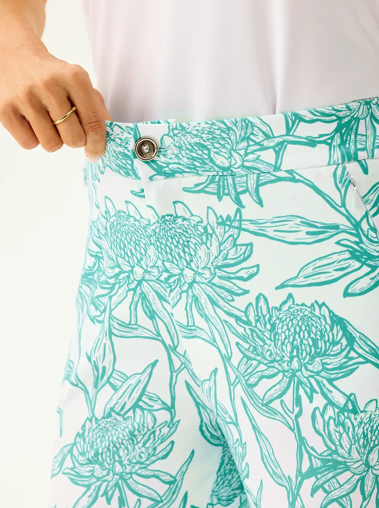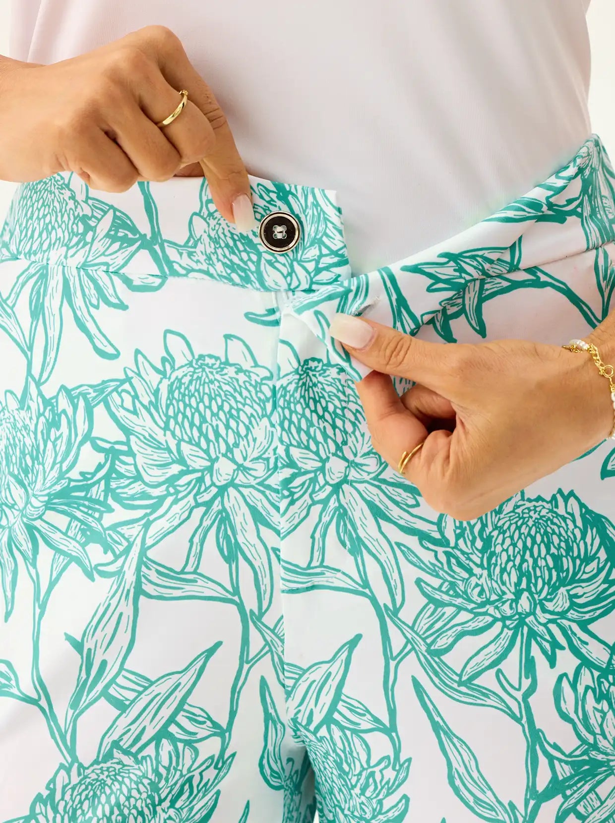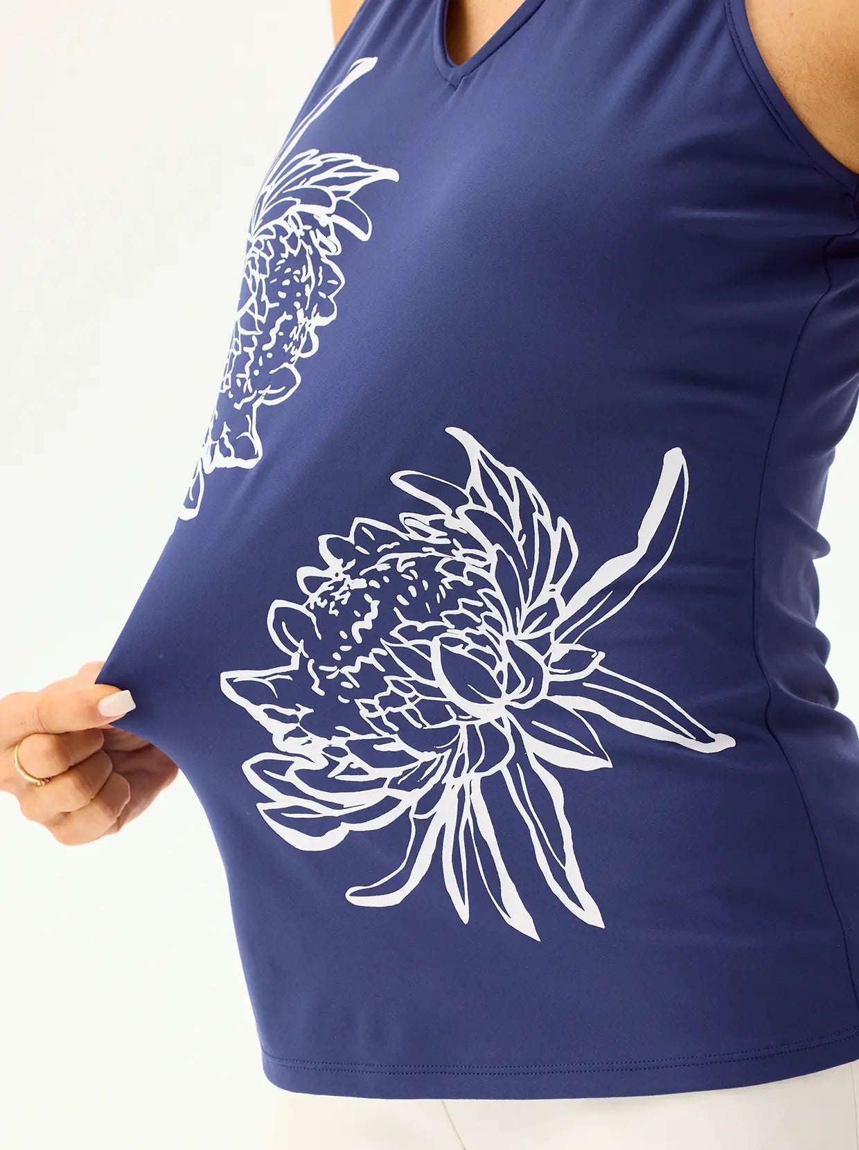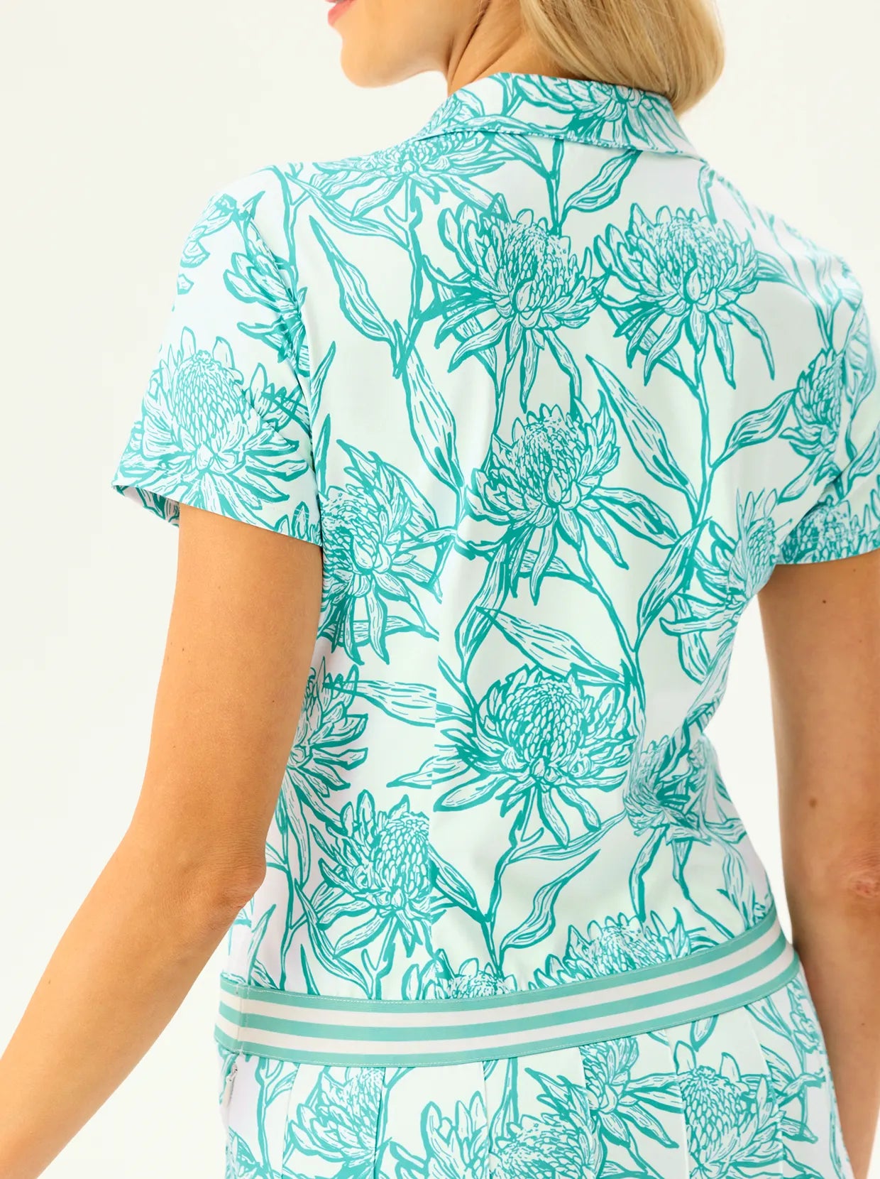 This material is so soft and stretchy! The perfect golf top!! I love the color:)