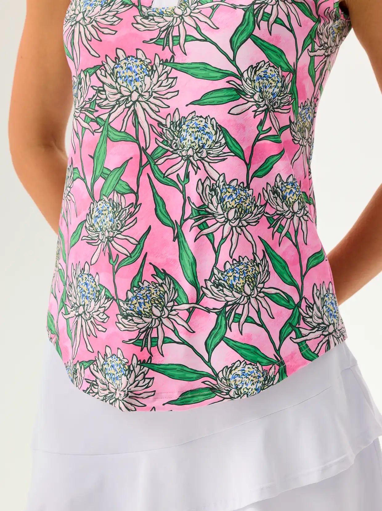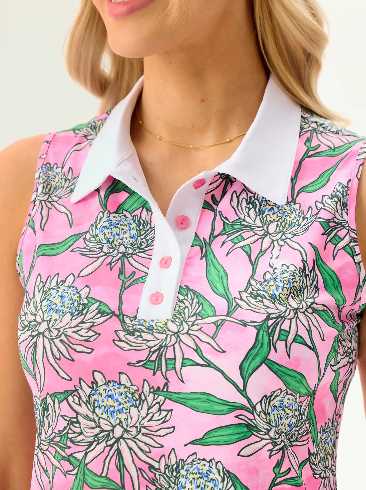 Tropical Flower Button-placket Ruffled Sleeveless Polo Top