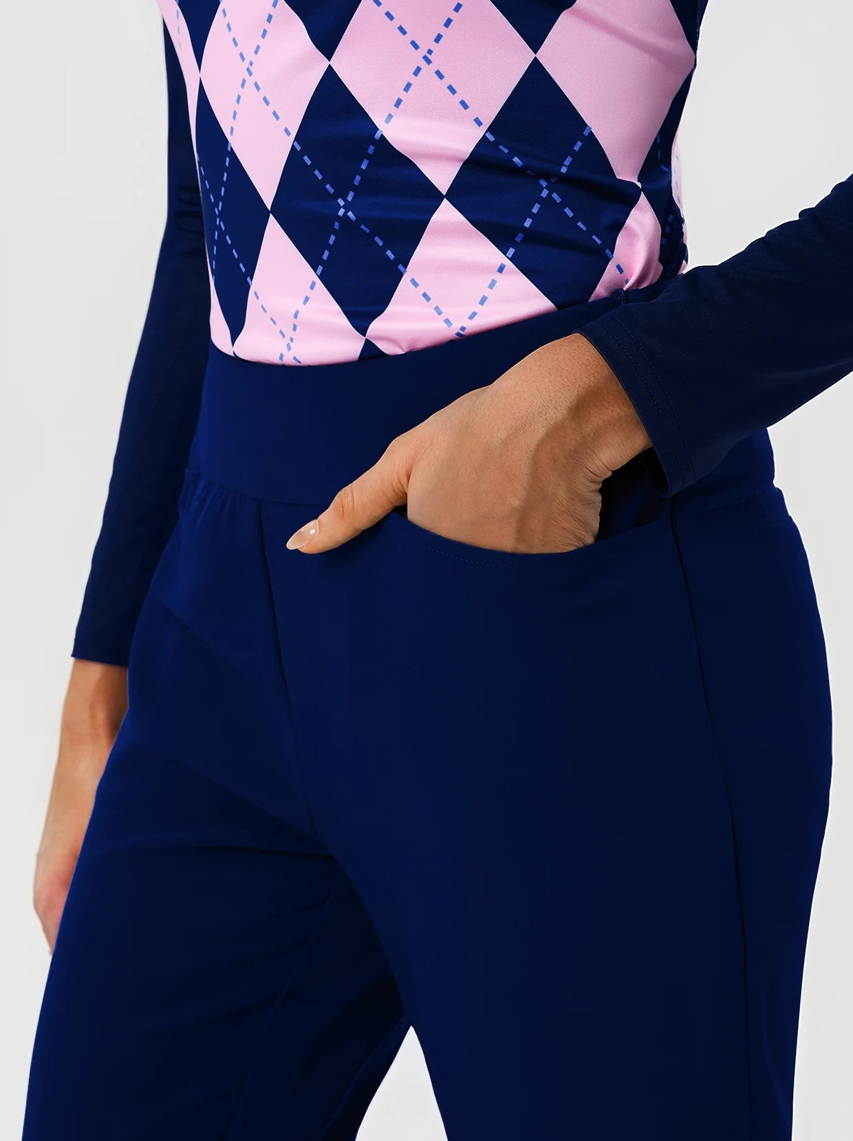 I love this black and blue argyle long-sleeve polo top! The fit is perfect, the material feels soft and comfortable, and the design is classic yet stylish. Great for both casual and semi-formal looks.