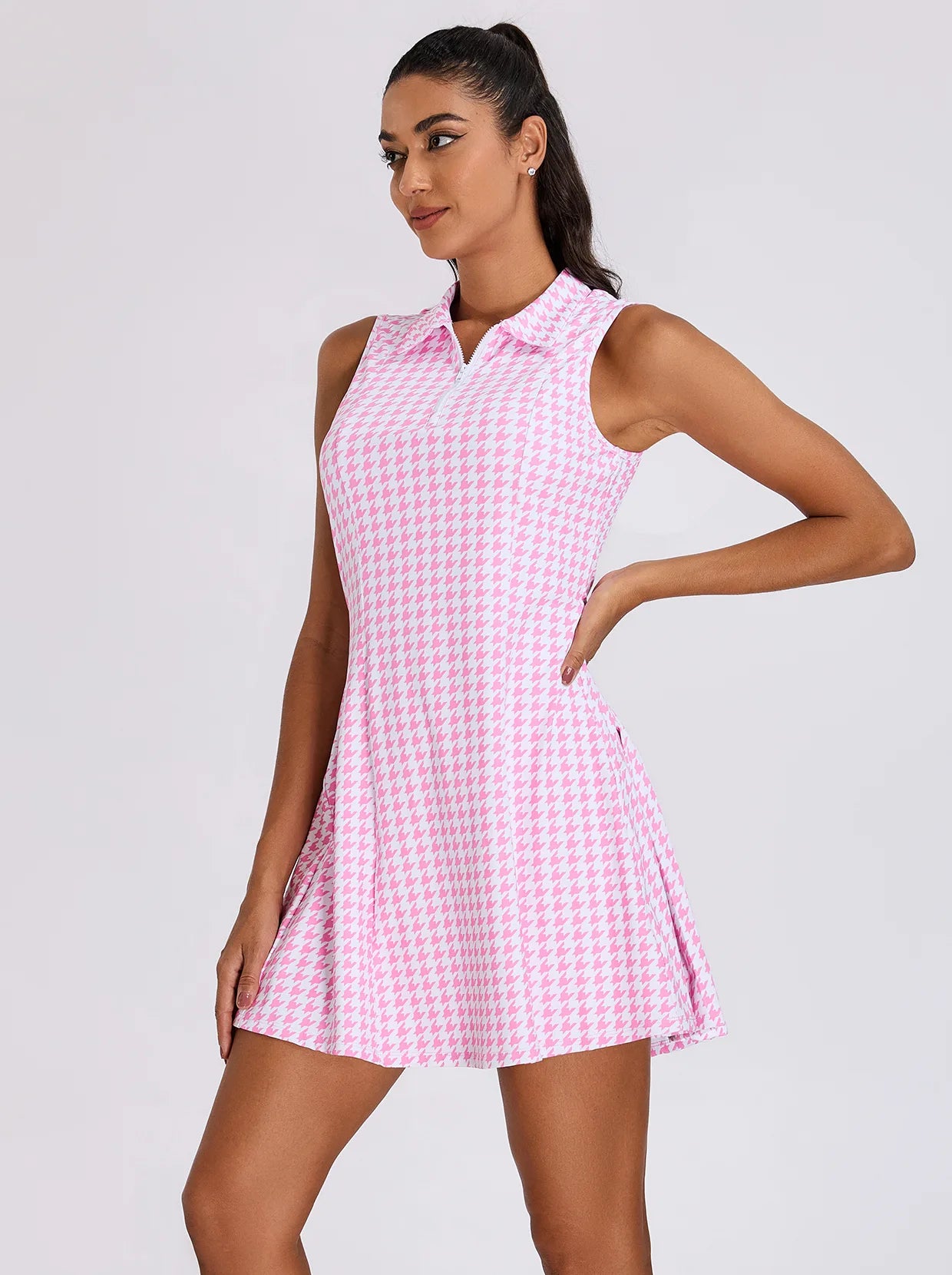 30 reviews34" Pink Houndstooth Quarter-zip Sleeveless Dress For Women