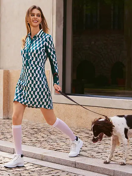 Bring a touch of Golden Time countryside elegance to your fall wardrobe with the Heritage Charm Pleated Dress. The diamond-check detail and flowing pleated skirt catch the breeze with every step. Lightweight and refined, it’s a dress that transitions effortlessly from swing to fall evenings, making it an essential piece of women’s golf apparel that balances charm with movement.