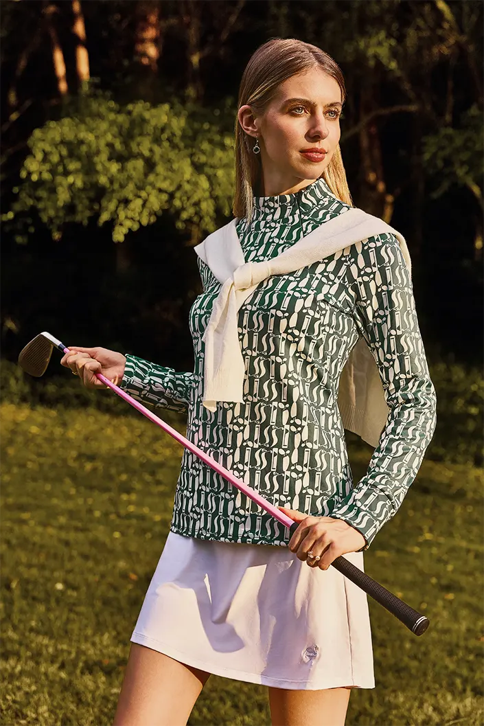 Step onto the fairway or stroll through an autumn park in the Evergreen Swing Side-Zip Polo. Its subtle golf-inspired print paired with crisp white bottoms radiates effortless elegance, while the angled side-zip lets you adjust for cooler fall mornings. Made from breathable, 4-way stretch fabric, this polo moves with you, swing after swing, or from the course to a casual lunch. Available in deep green and classic navy, it’s the perfect addition to your fall golf outfits.