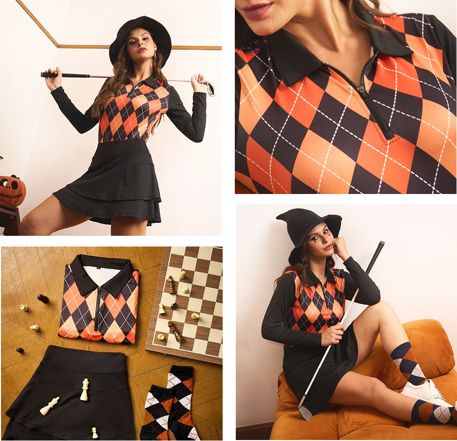 Step into playful style with this orange-and-black diamond-check quarter-zip polo. Pair it with a sleek black skirt for a chic look that balances Halloween fun and fairway-ready performance. Bold colors and classic checks make every swing a statement.