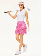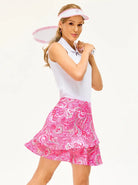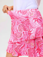 Bring vibrant style to your active wardrobe with this pink paisley skort. Ruffled details and a bold print design make every move fun, while built-in shorts and pockets deliver practical coverage and storage. The stretchy, moisture-wicking fabric dries fast and keeps you cool whether you're golfing, playing tennis, or heading on vacation.