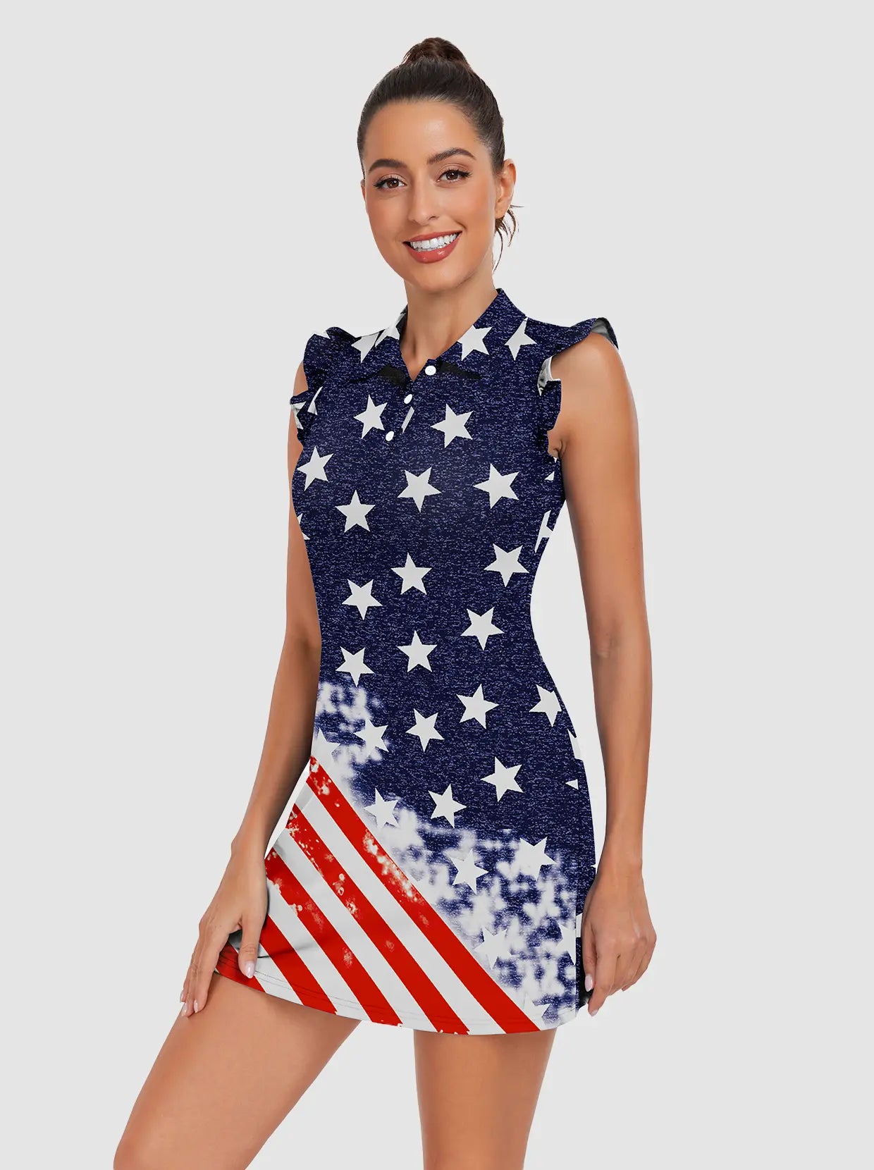 34" Flag Print Button-placket Ruffled Sleeveless Dress with Shorts