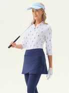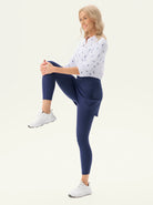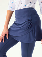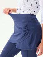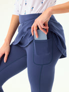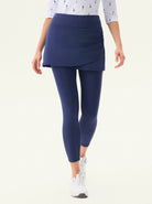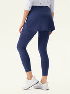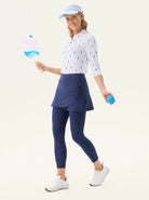 Move with confidence in our cropped leggings with a playful crossover hem and pleated skirt. Designed for both style and performance, they feature a comfortable elastic waistband and handy inner pockets. The fabric offers 4-way stretch and is both moisture-wicking and breathable. Available in black, blue, and grey, they're perfect for golf, tennis, pickleball, or everyday wear.