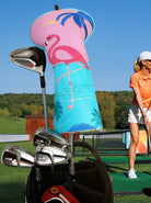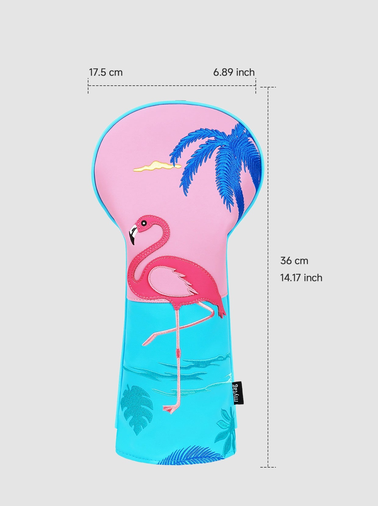 Defend your driver with this vibrant flamingo headcover. Built with a plush protective lining and premium leather shell, it withstands the rigors of regular play while keeping your club safe from scratches and impact. The elastic band system grips securely around your club head, and the hassle-free design slips on and off in seconds. Finished in an eye-catching blue and pink tropical pattern that stands out in any golf bag.