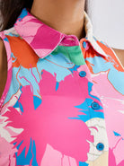 Wrap yourself in comfort with our colorful floral sleeveless button-down shirt. The racerback design offers a unique twist to the classic button-down shirt, making it perfect for various occasions. The moisture-wicking and breathable fabric ensures you stay cool and dry, while the 4-way stretch offers maximum flexibility. Perfect for casual outings or a day at the park.