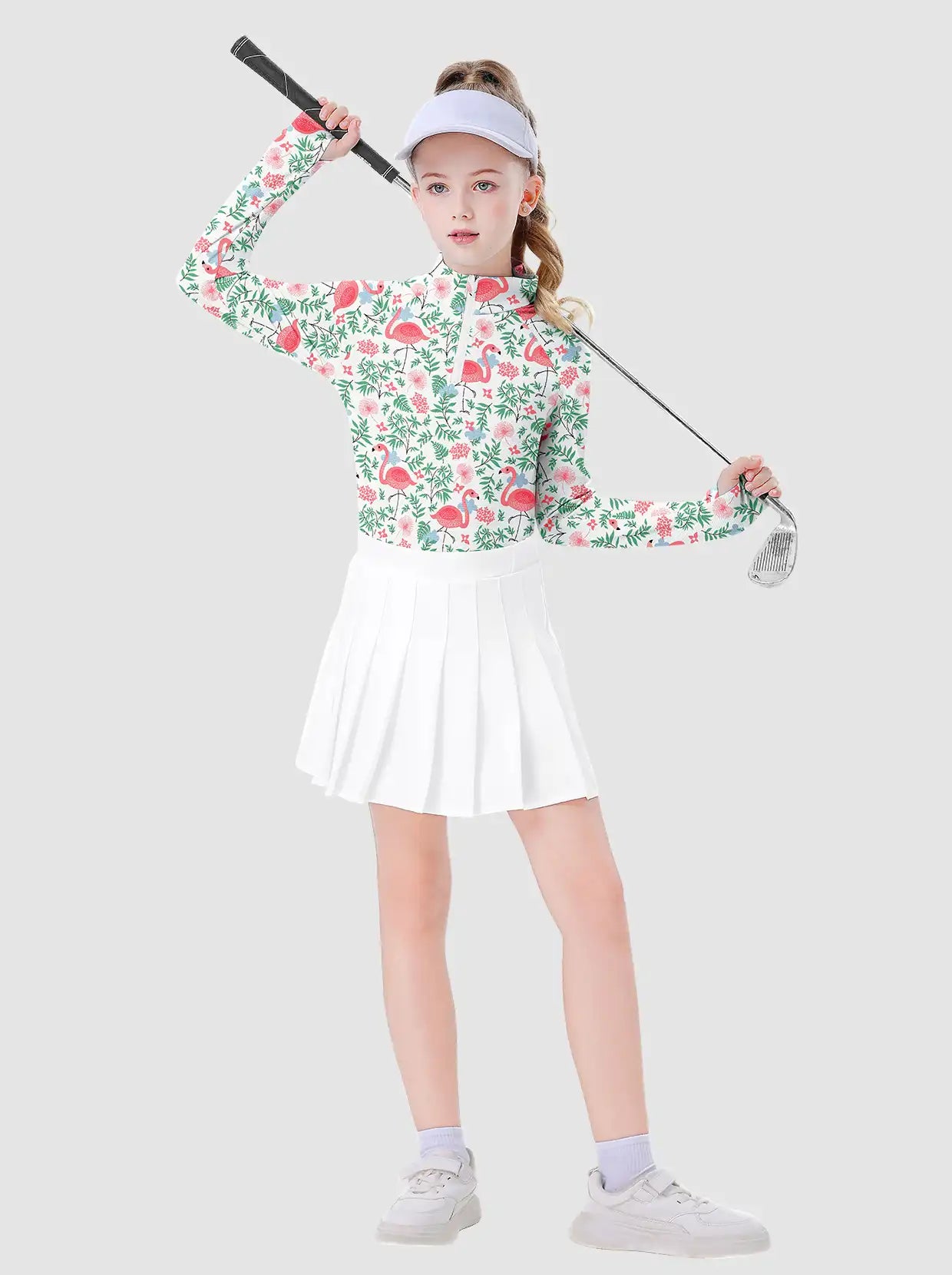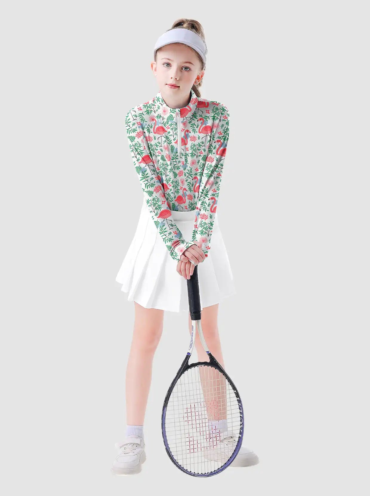 Get ready to take on the day in style and comfort. With this quarter-zip long-sleeve shirt, featuring an active fit with moisture-wicking, quick dry, and stretch material, you'll stay comfortable and dry. Designed with a pink flamingo pattern and a quarter-zip design, this shirt is perfect for ages 6-14 and will become a staple in your wardrobe for any occasion.