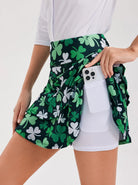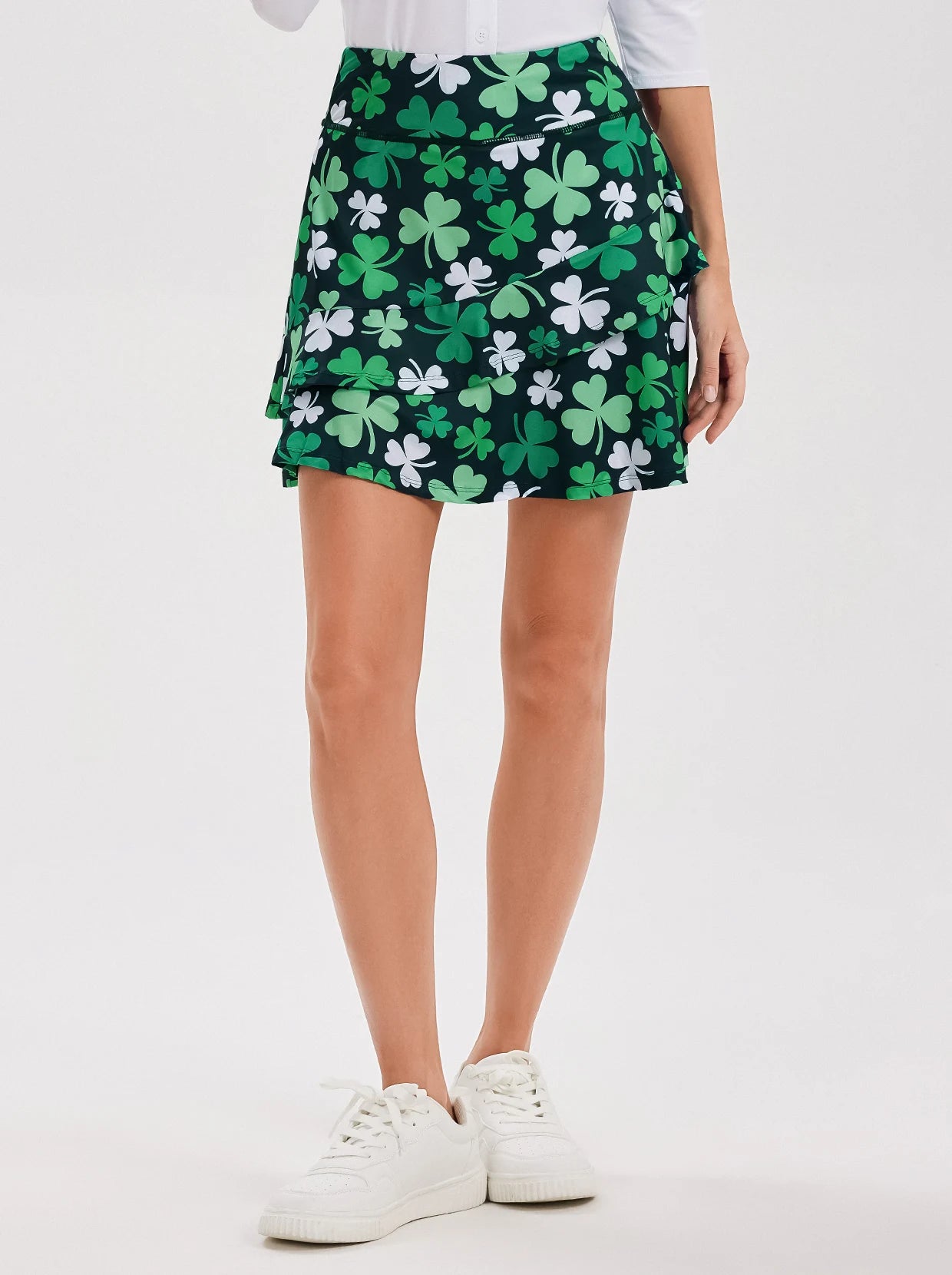 17" Green and White Shamrock Double-Layer Ruffled Skort with Pockets