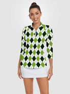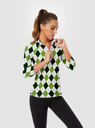 Green Checkerboard Floral Quarter-zip 3/4 Sleeve Polo Shirt For Women