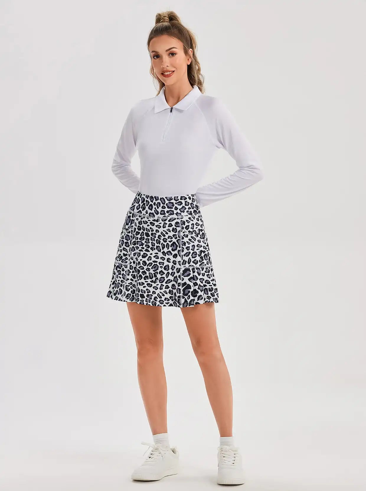 Enjoy all-day comfort and protection from the sun with our UPF50+, leopard pleated skorts. Made with soft and moisture-wicking material, our active skort also offers the convenience of built-in shorts and pockets, perfect for all your favorite activities and casual outings. The leopard pattern adds a touch of personality to this versatile piece.