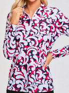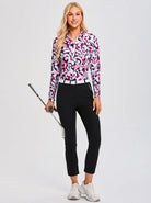 White and Black Print V-Neck Long-sleeve Golf Polo Shirt for Women