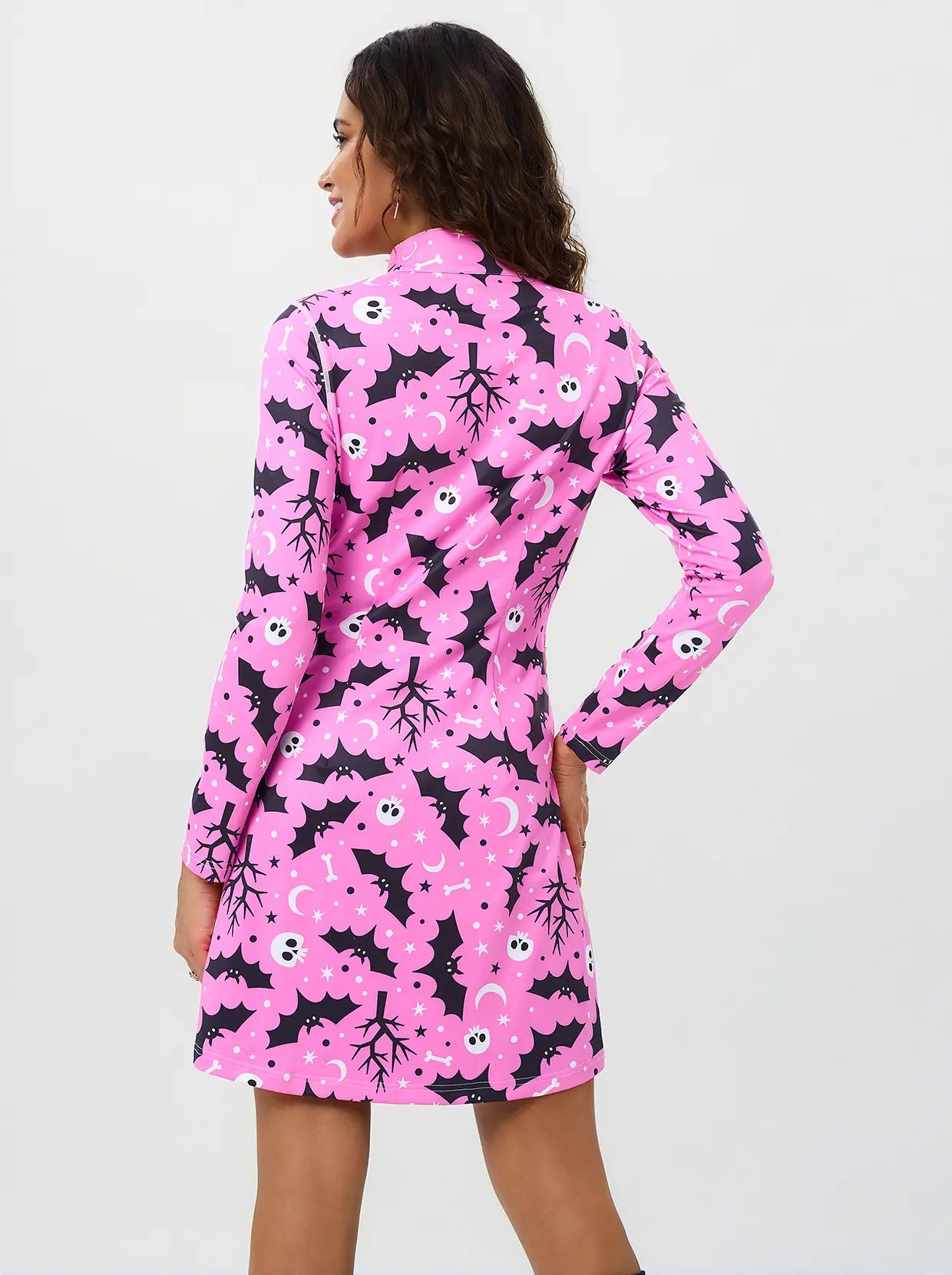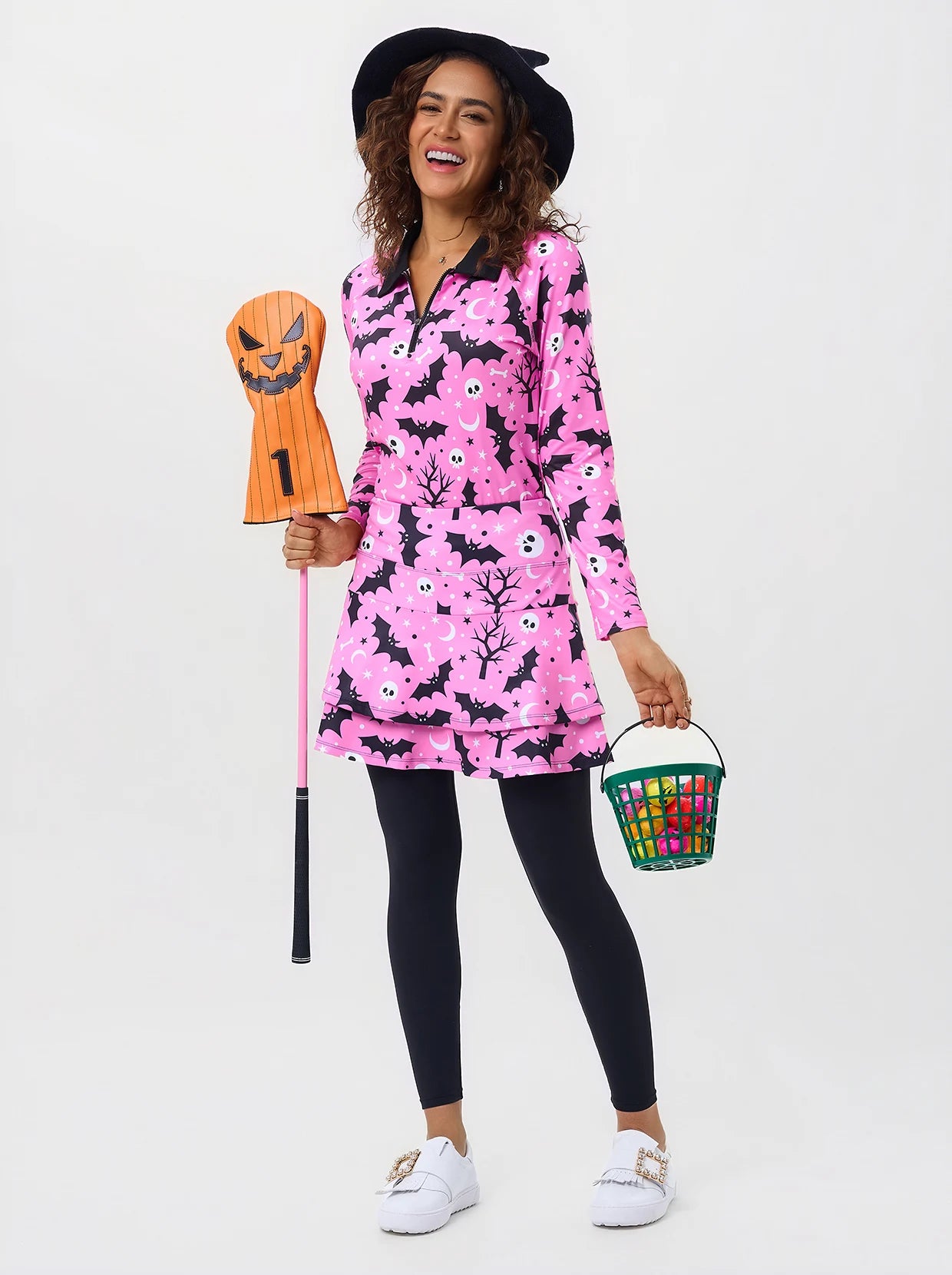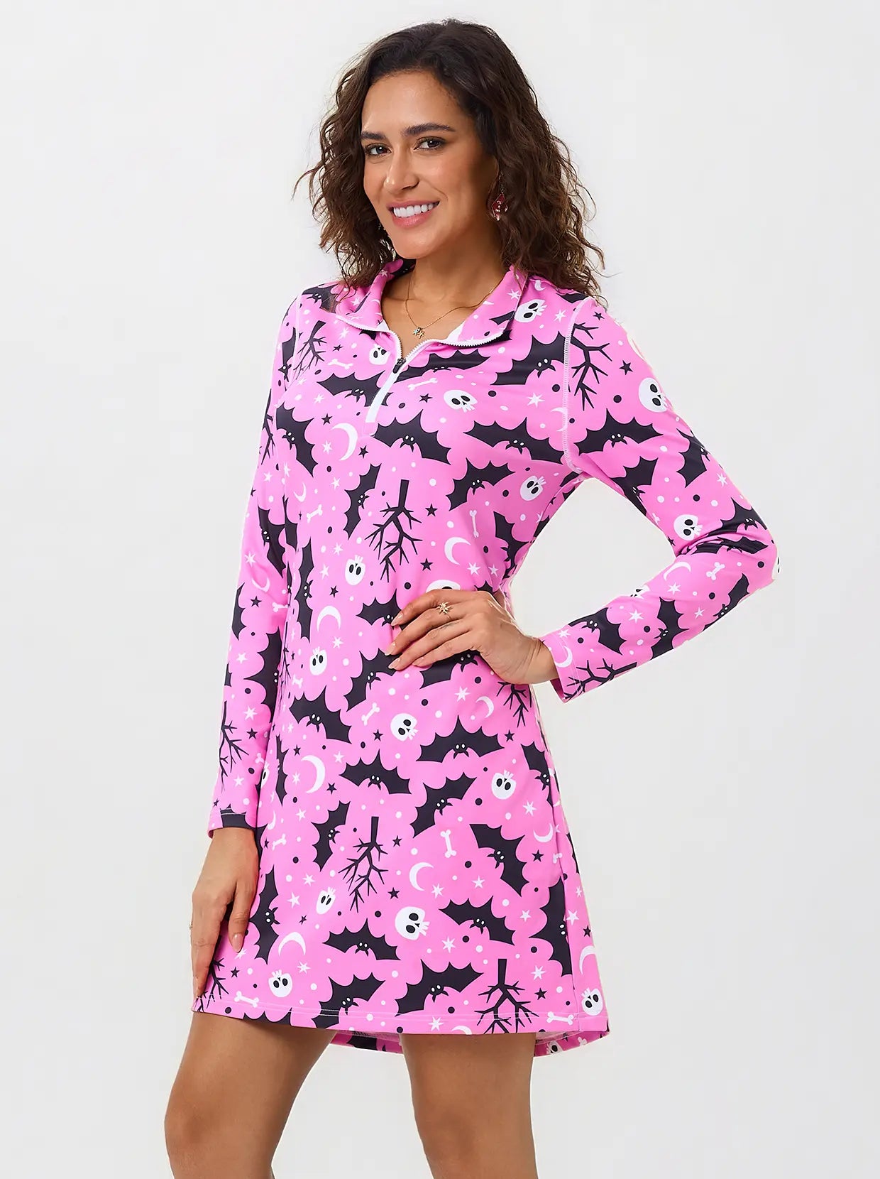 Halloween Pink Bats Quarter-zip Long-sleeve Polo Dress with Shorts