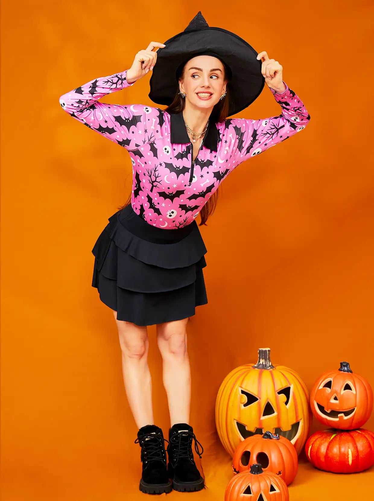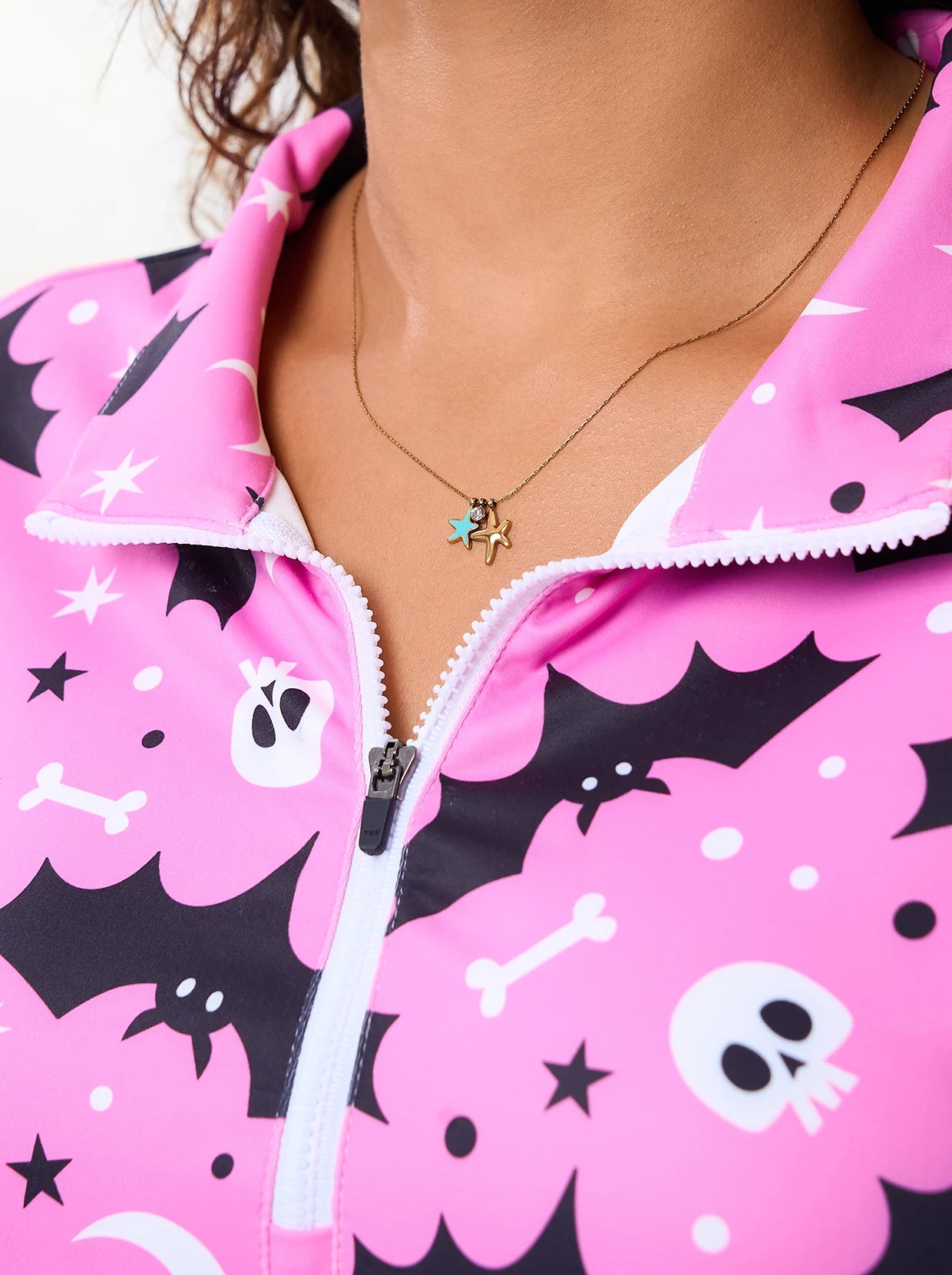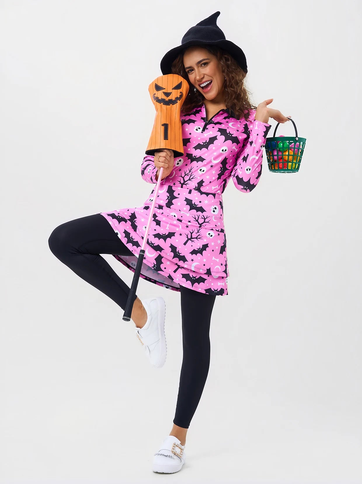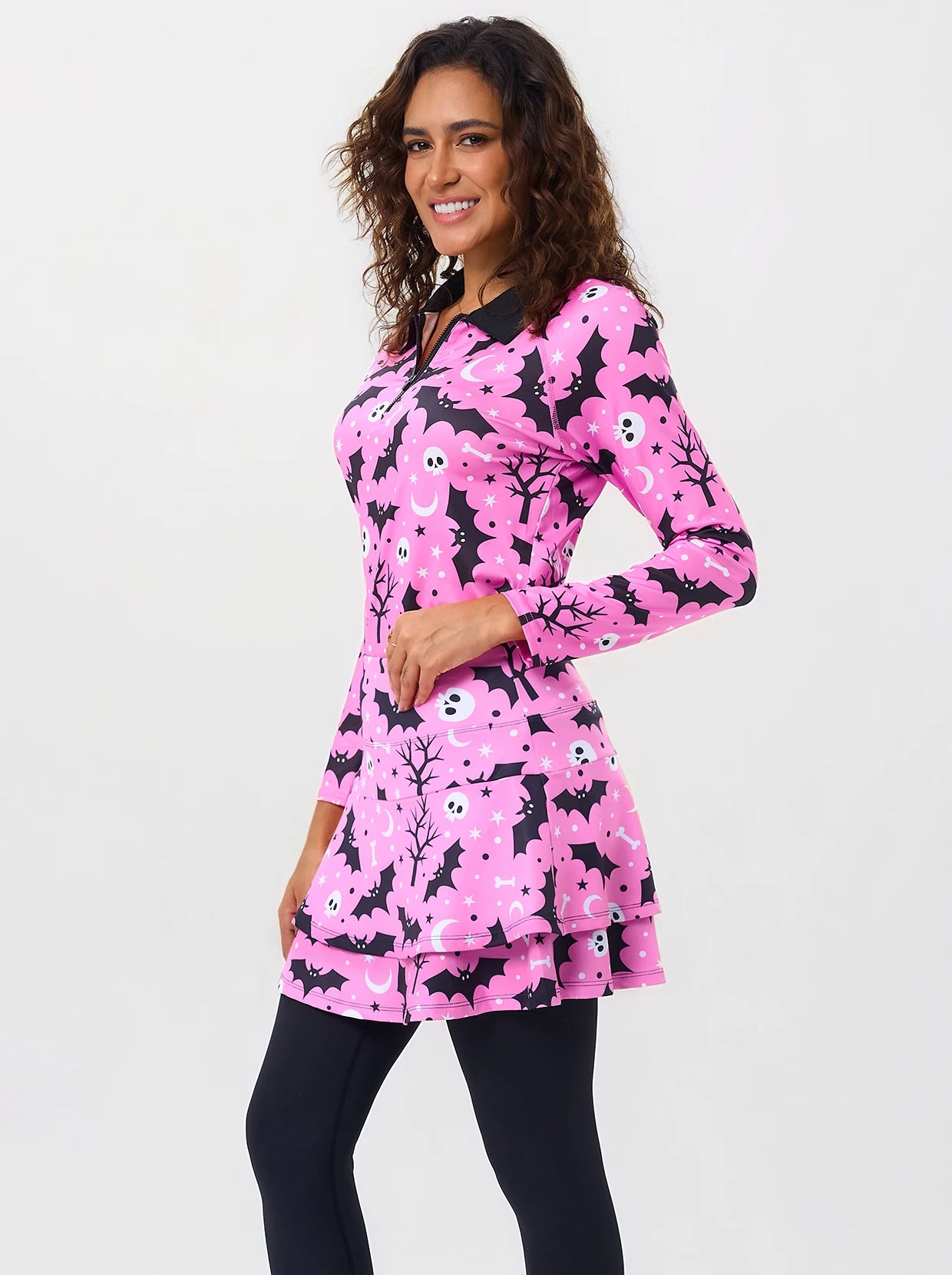 Halloween Pink Bats Quarter-zip Long-sleeve Polo Dress with Shorts