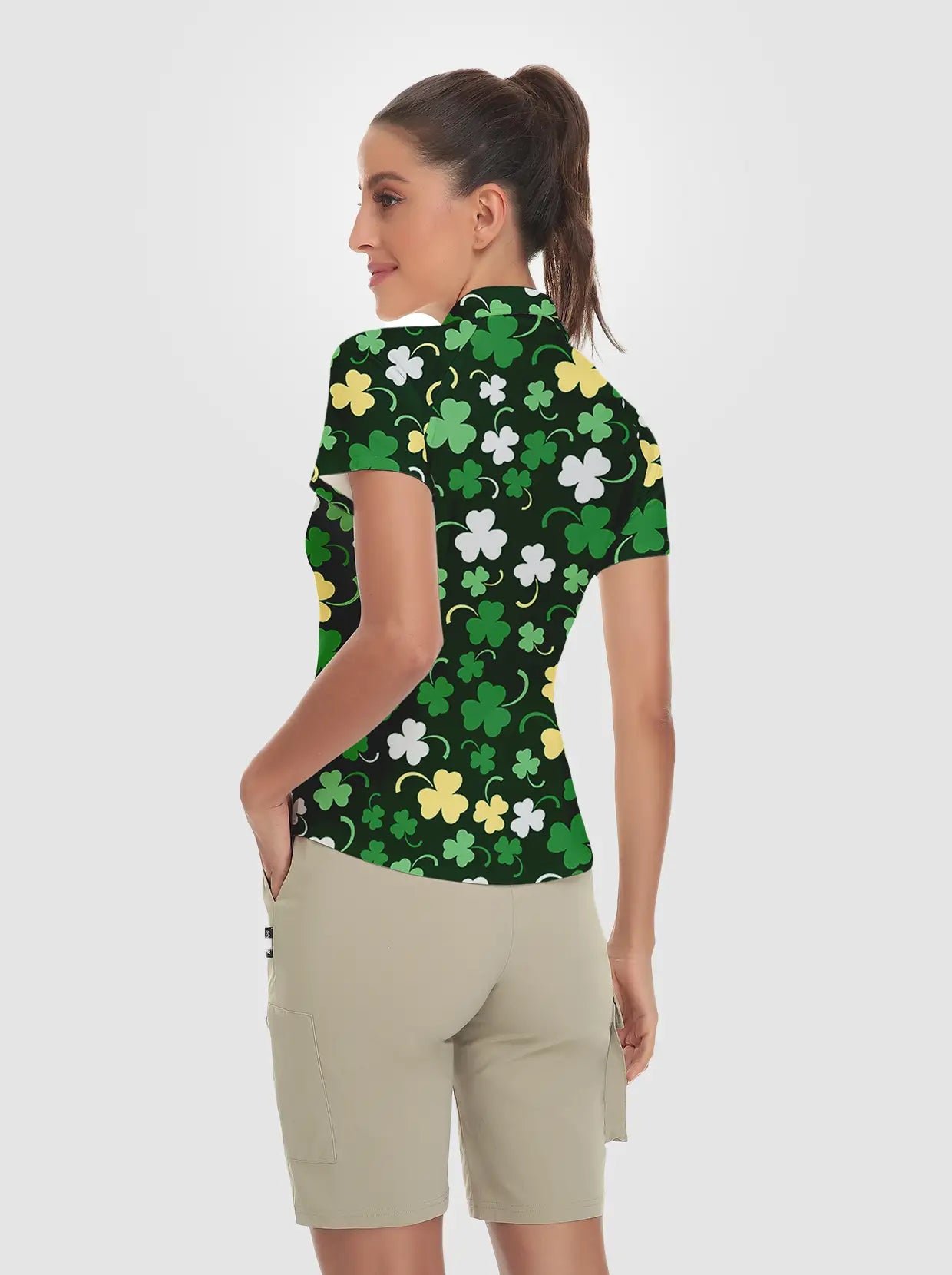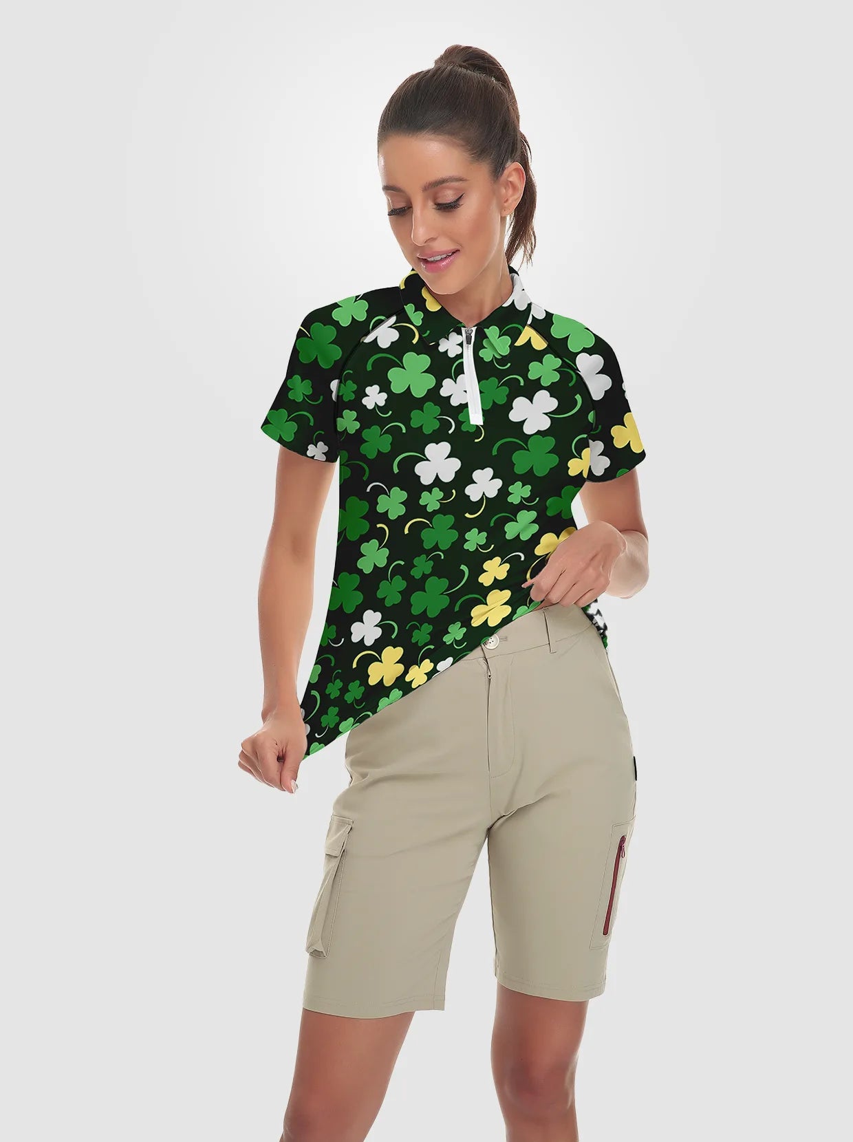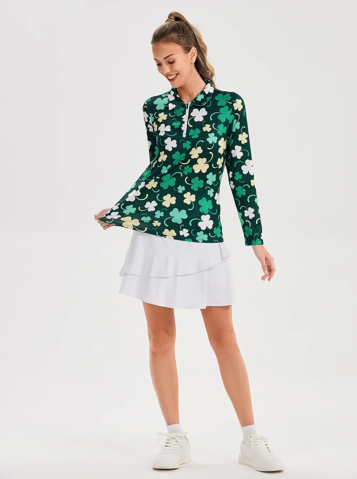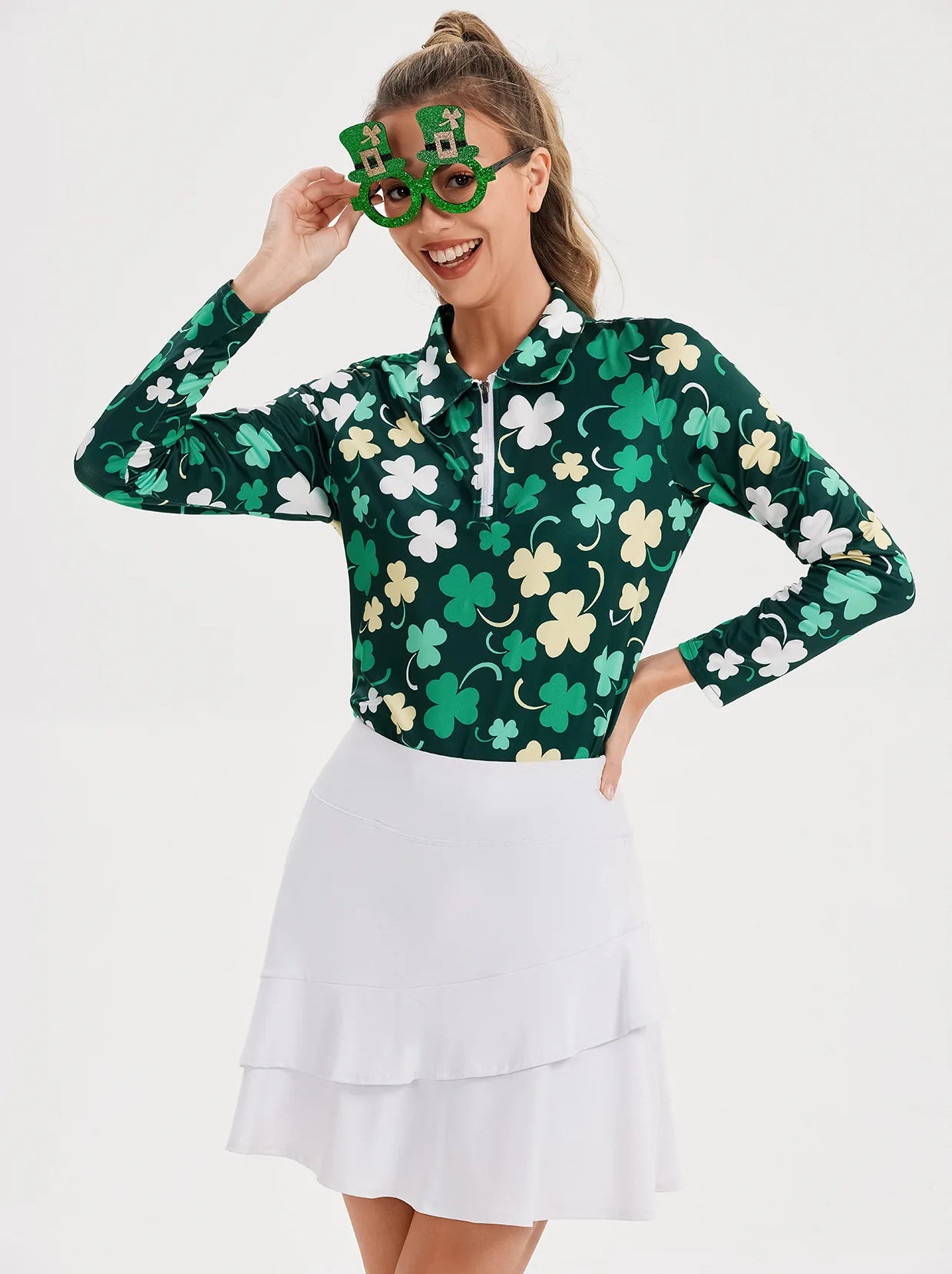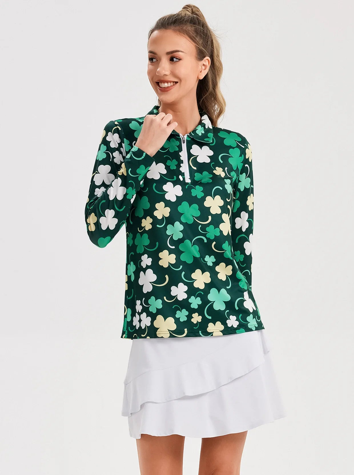 Green Shamrock Quarter-zip Long-sleeve Polo Shirt for Ladies