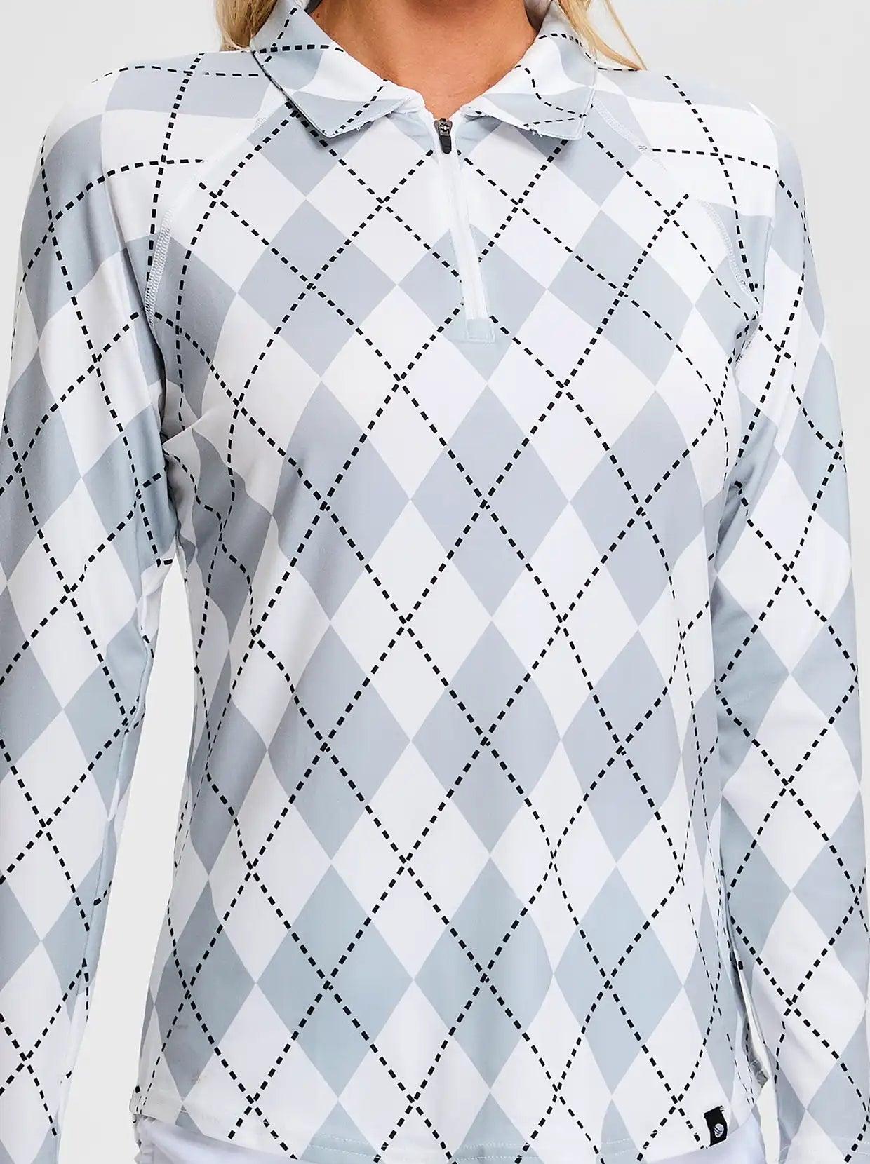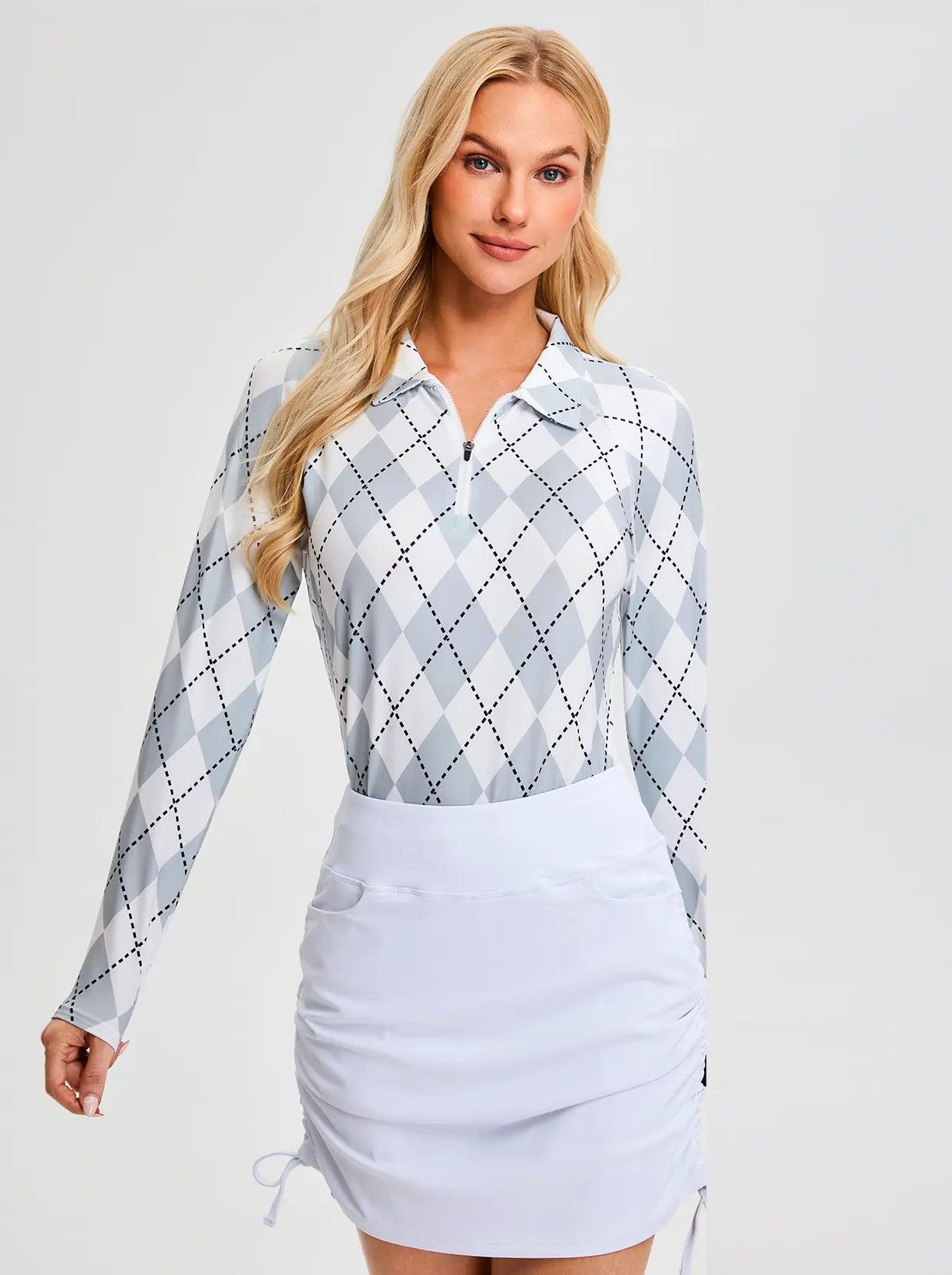 Grey Checkerboard Quarter-Zip Long Sleeve Shirt for Women