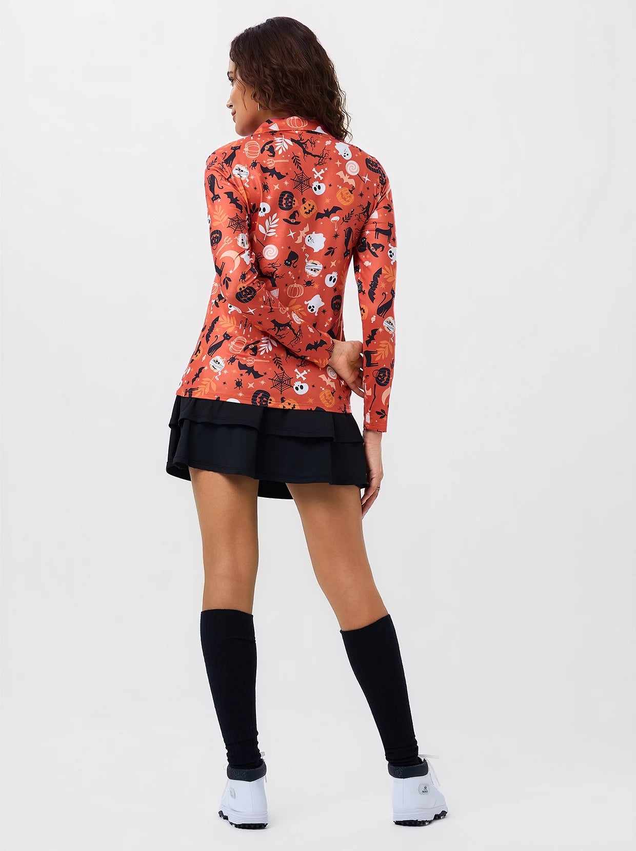 Halloween Fun Pumpkin Pattern Quarter-Zip Long-Sleeve Polo Tops for Ladies