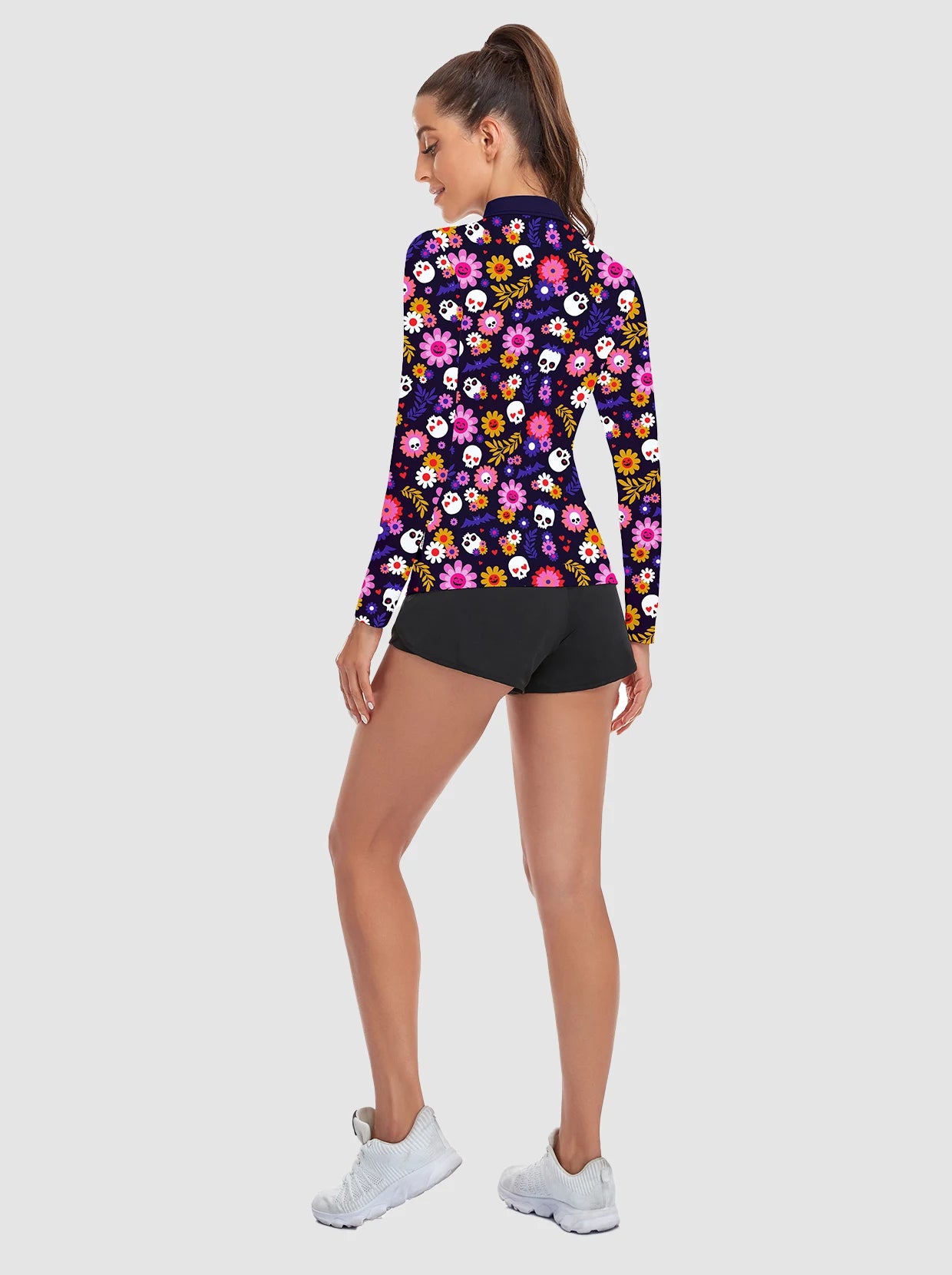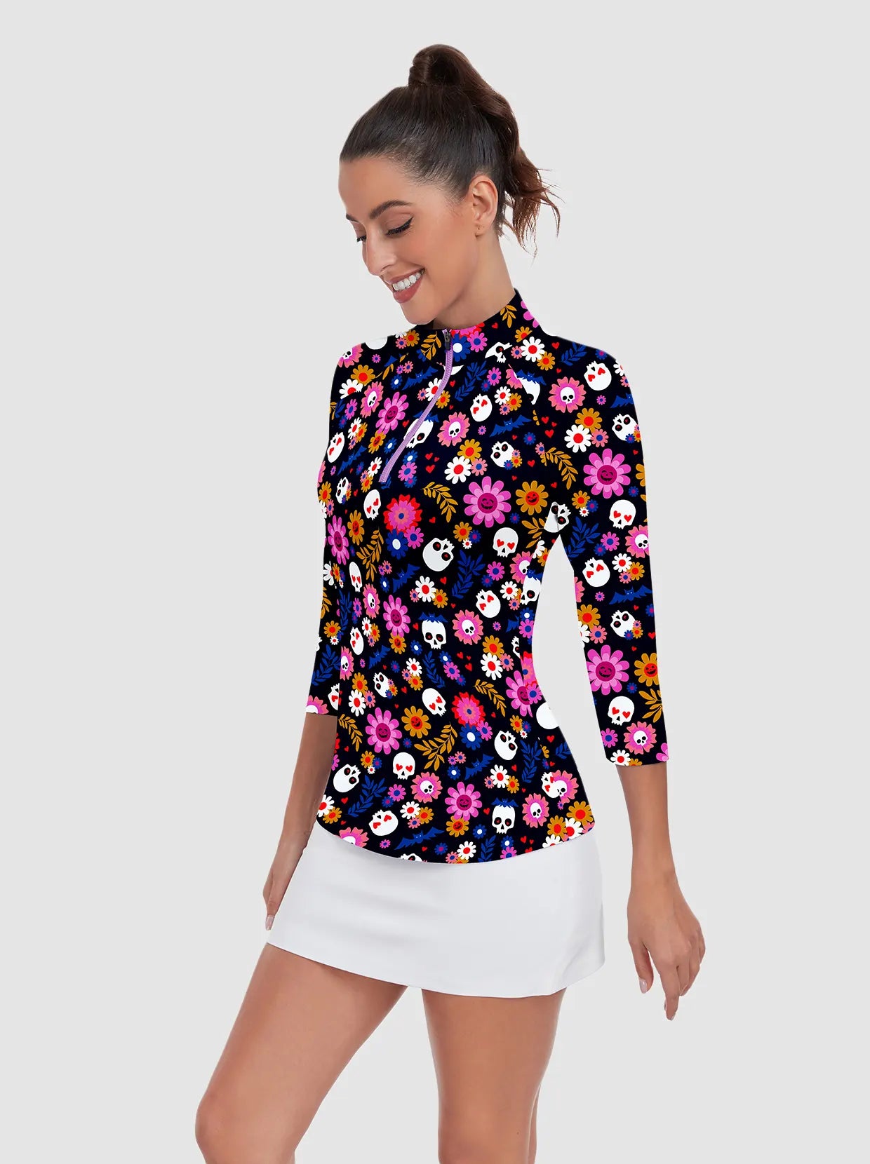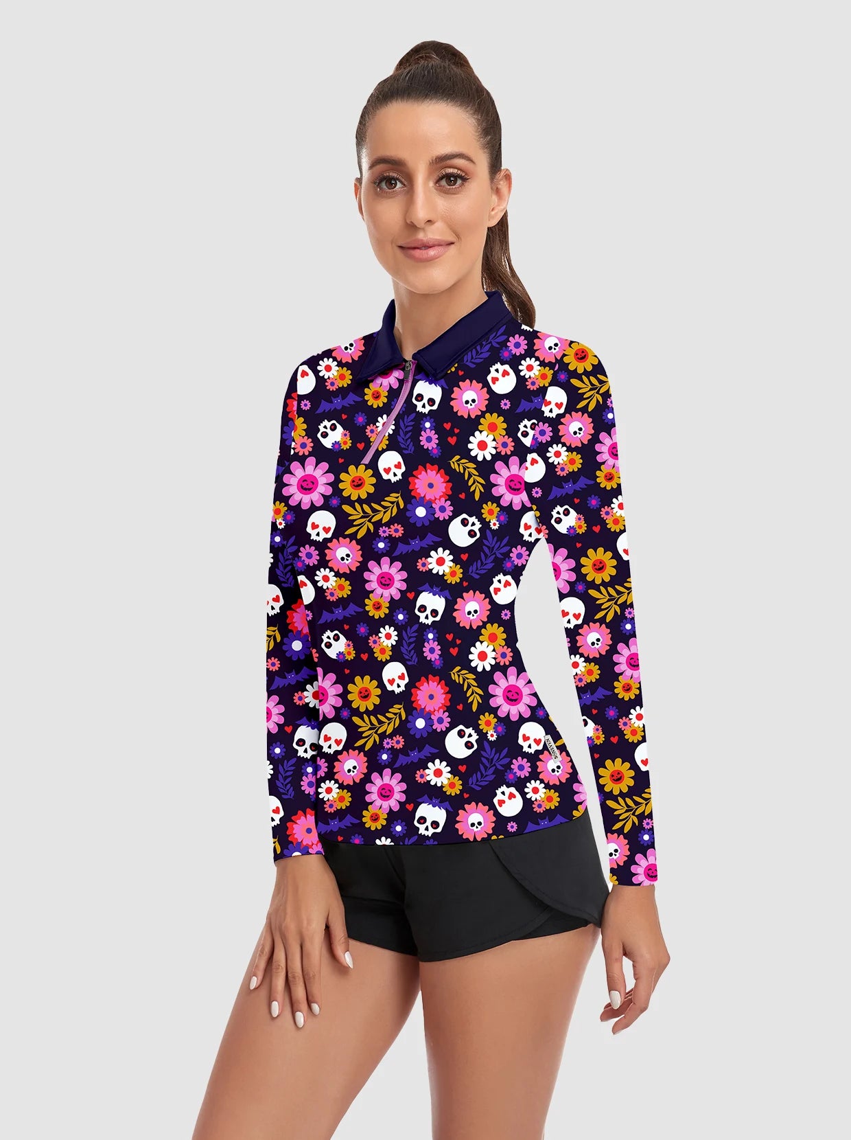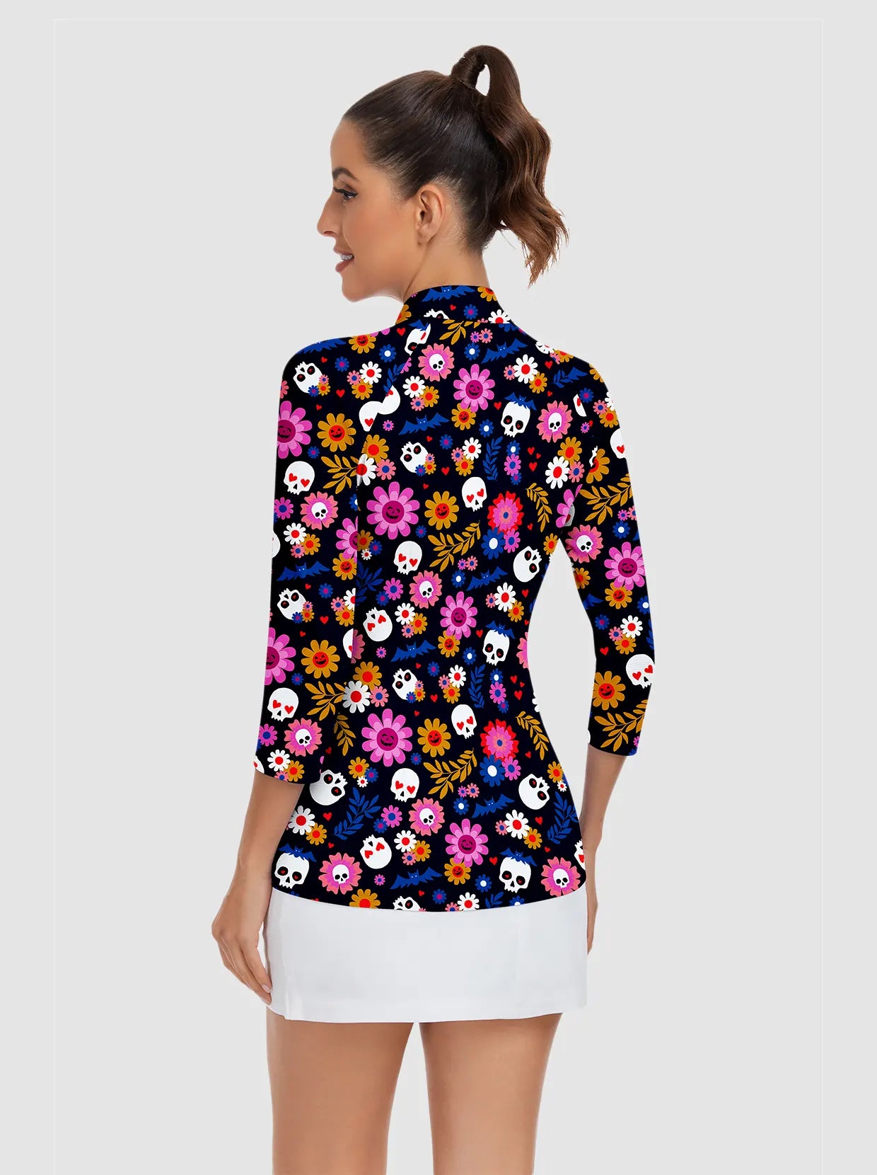 Halloween Chic Skull and Floral Quarter-Zip Long-Sleeve Polo Tops