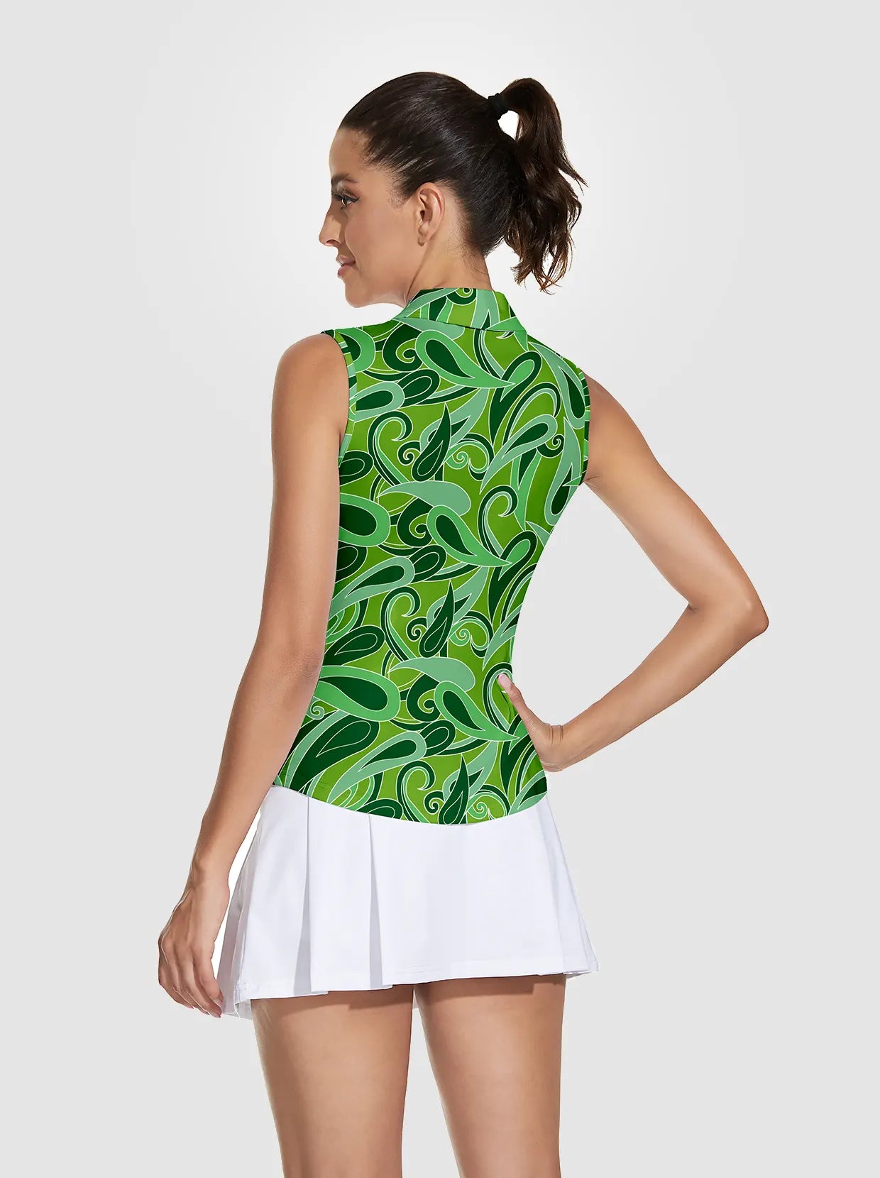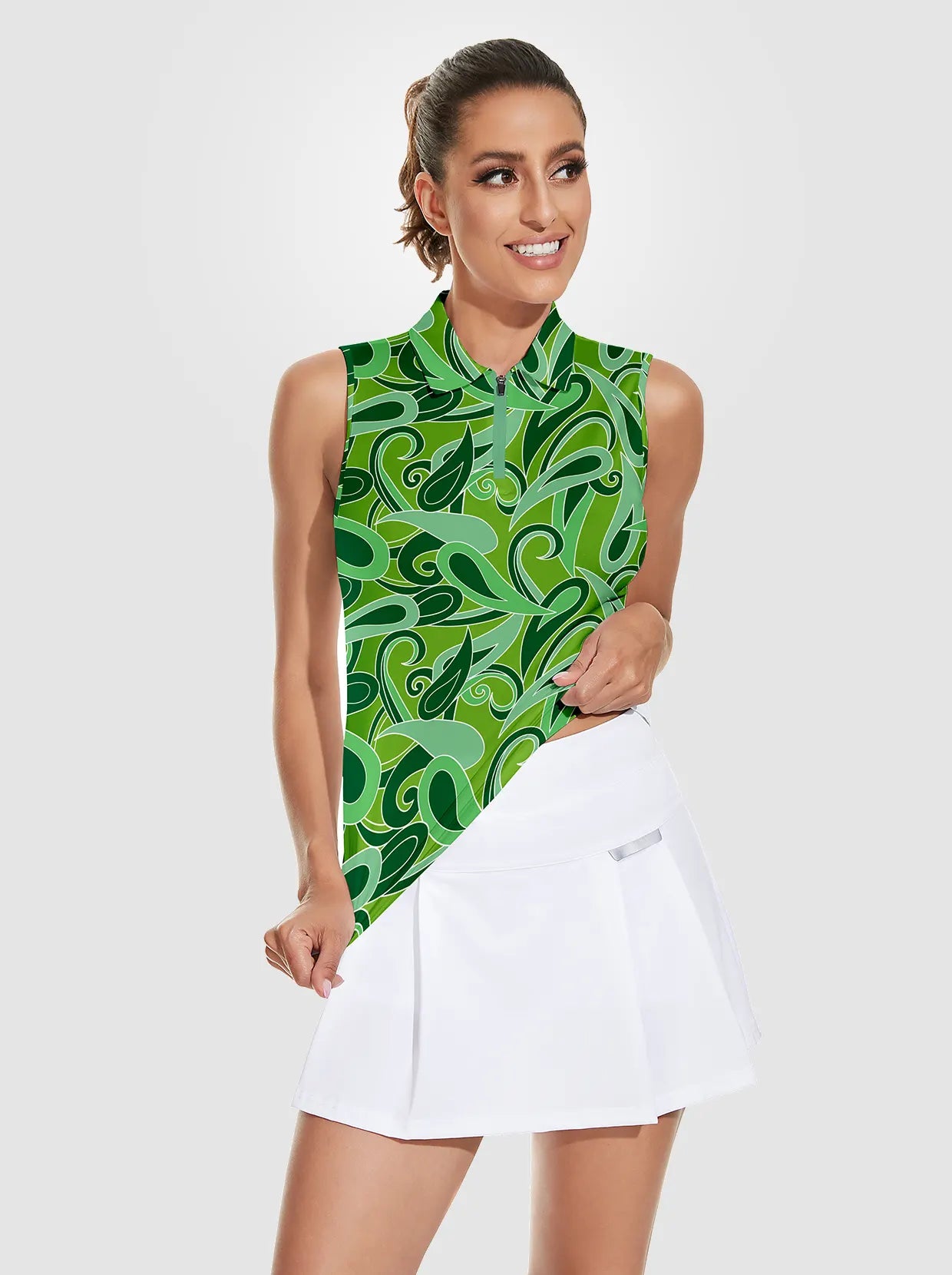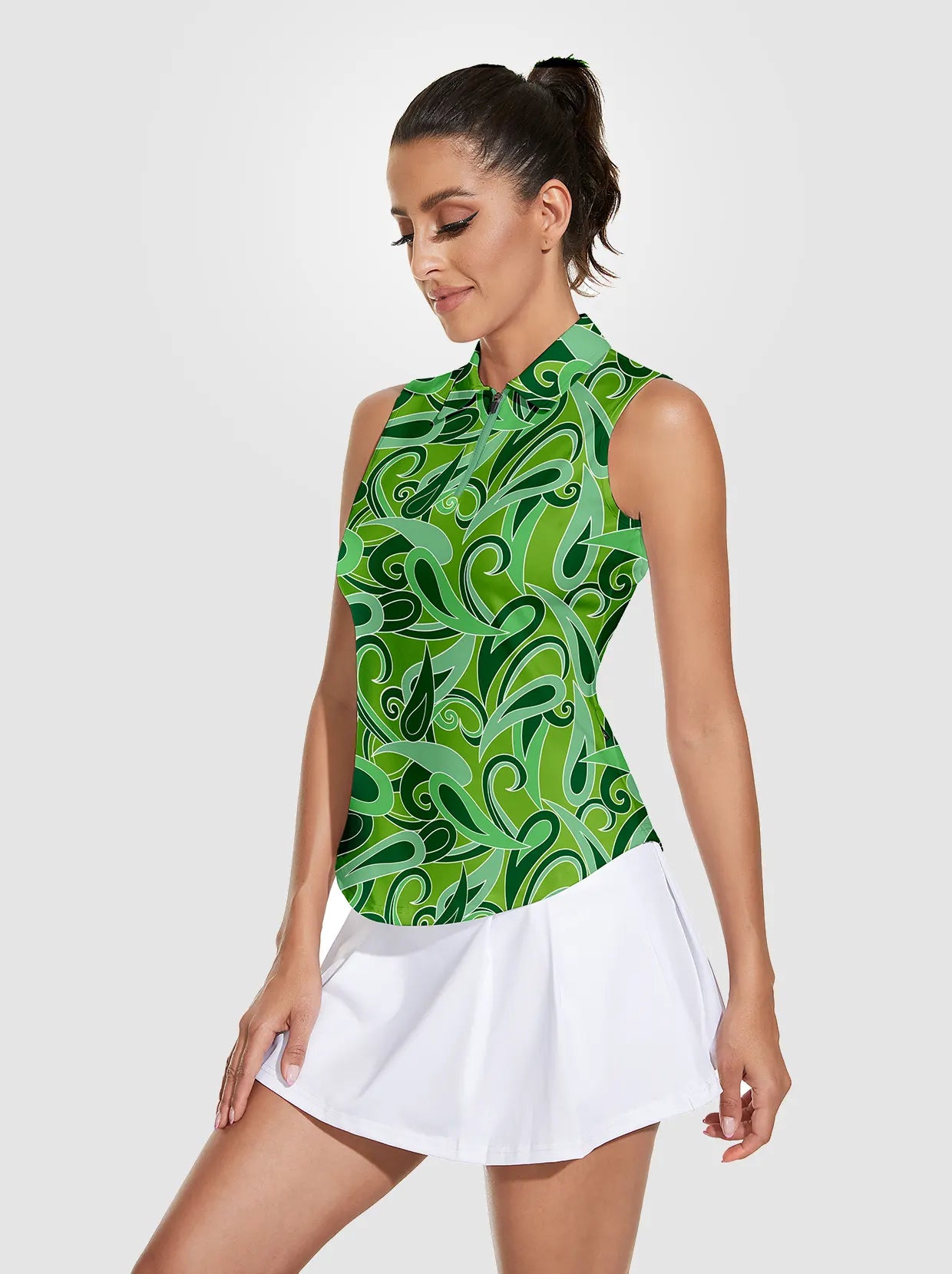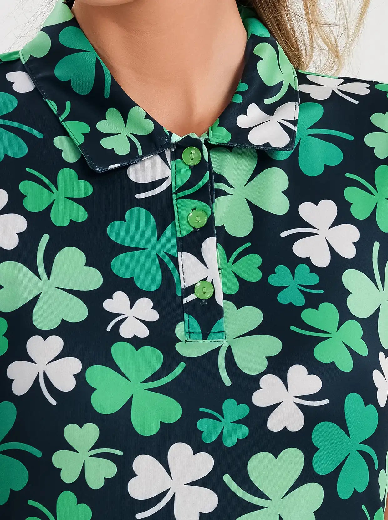 Green Shamrock Ruffled Sleeveless Polo Shirt For Women