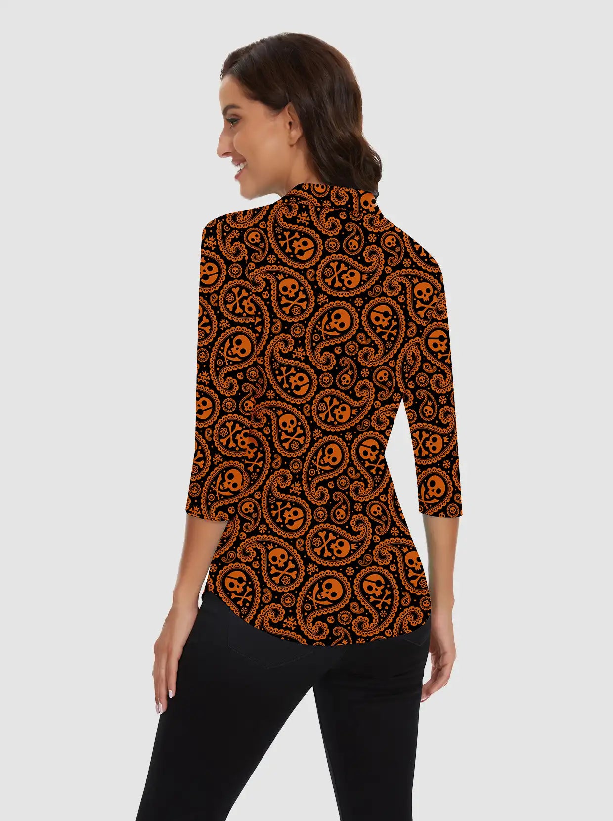 Halloween Floral and Skull Print Quarter-zip 3/4 Sleeve Shirt For Women