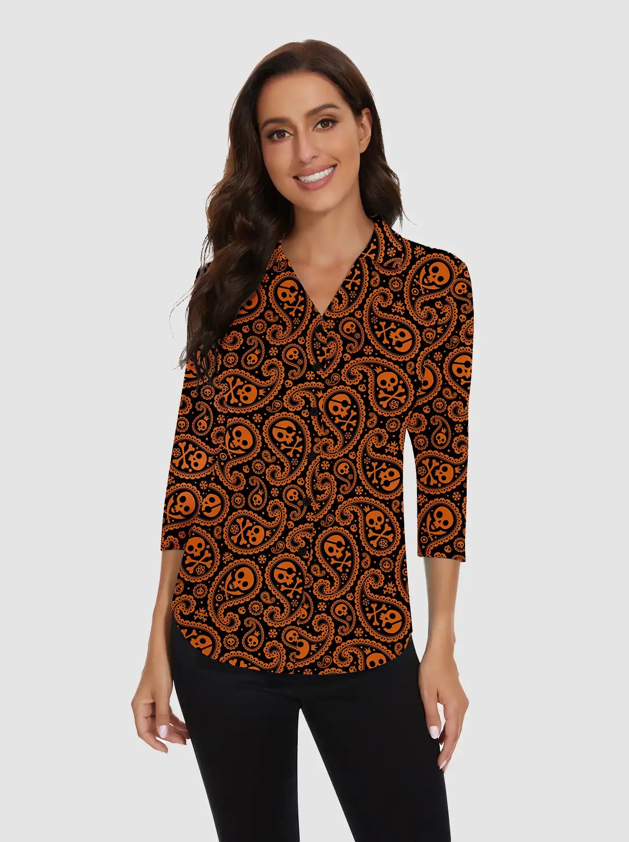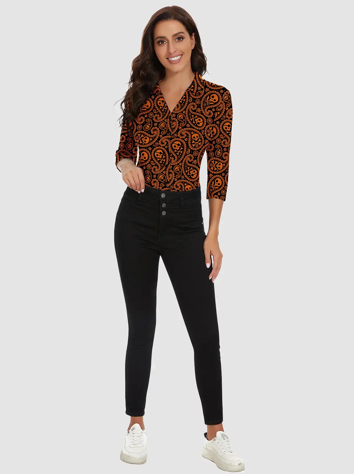 Halloween Orange Skull V-neck Button-Down 3/4 Sleeve Shirt