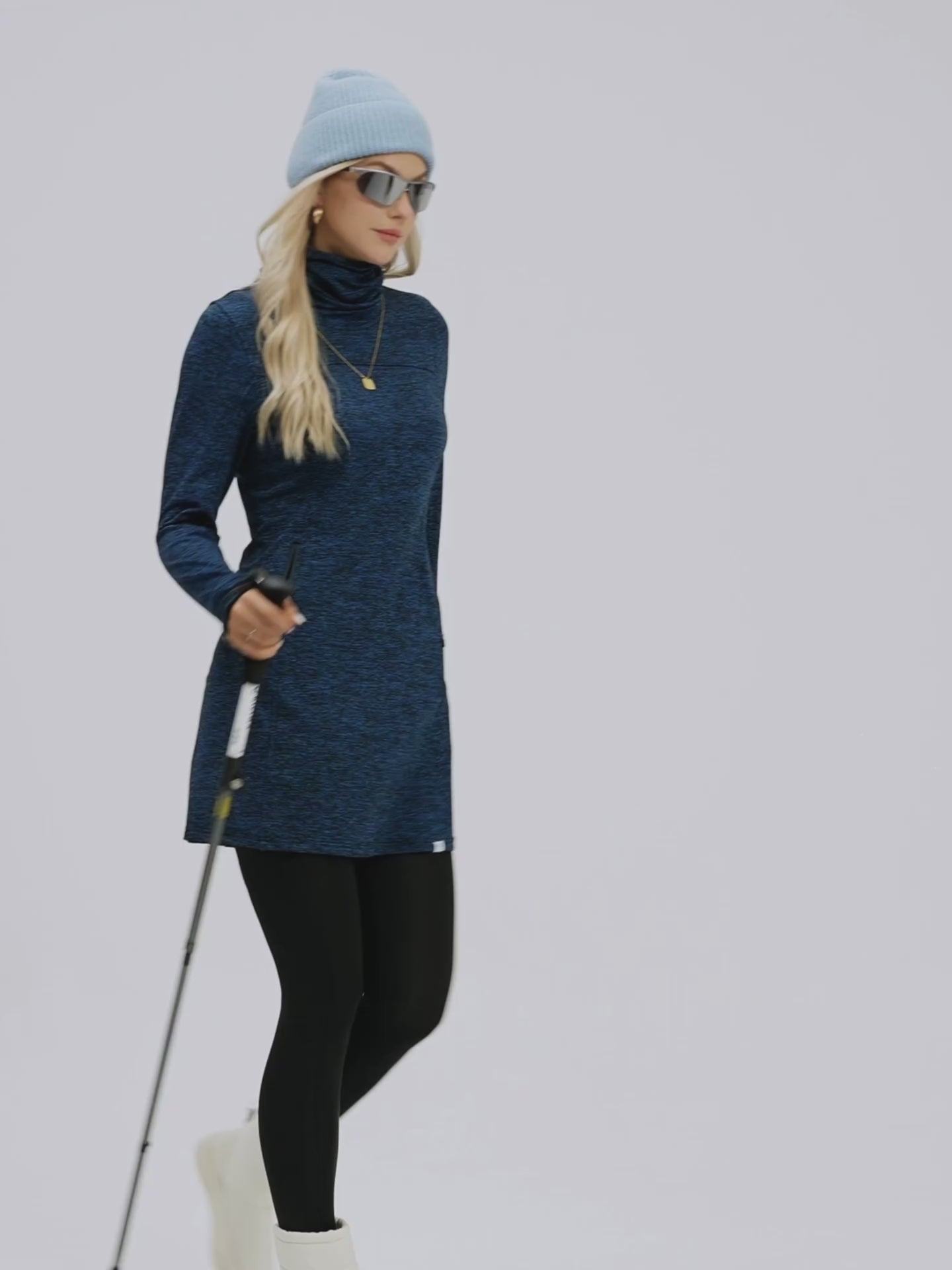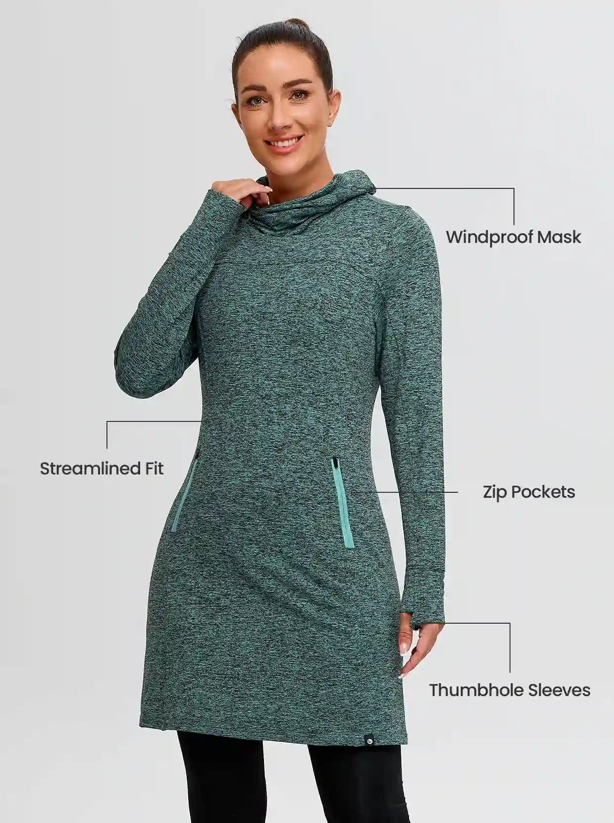 The Cowl Neck Long-Sleeve Fleece Dress blends style and functionality. Made from lining soft fleece, it offers ultimate comfort. Convenient pockets provide easy storage, while thumbholes keep the sleeve in place and provide added warmth. The cowl neck can be looped over the ears to serve as a face mask, keeping out the wind and retaining warmth.
