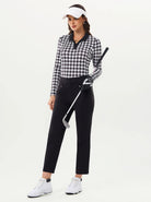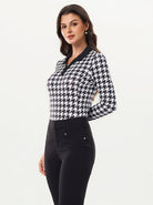 Black Houndstooth V-Neck Long Sleeve Polo For Women