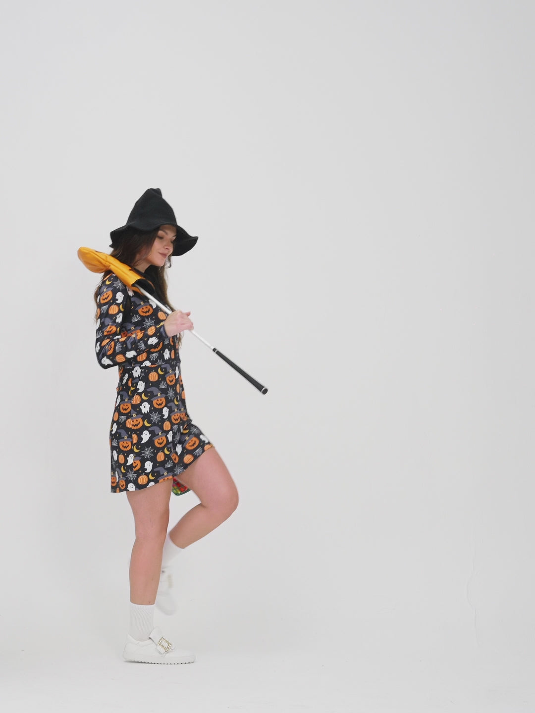 Feel the pumpkin perfection in our Halloween long-sleeve polo dress. The playful print adds a festive flair to your seasonal style, while the classic button placket offers a touch of timeless charm. Made from soft, breathable, and stretchy fabric, this dress is comfortable for all-day wear. Celebrate Halloween in comfort and style.