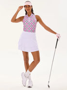 Step into effortless style and comfort with the Pink and White Checkerboard Quarter-Zip Sleeveless Shirt. Its stretch fabric is both breathable and moisture-wicking, adapting to your every move, whether you're on the golf course, tennis court, in the office, or out and about. The sleek collarless quarter-zip not only provides a contemporary look but also keeps you feeling cool and supported from morning to night.