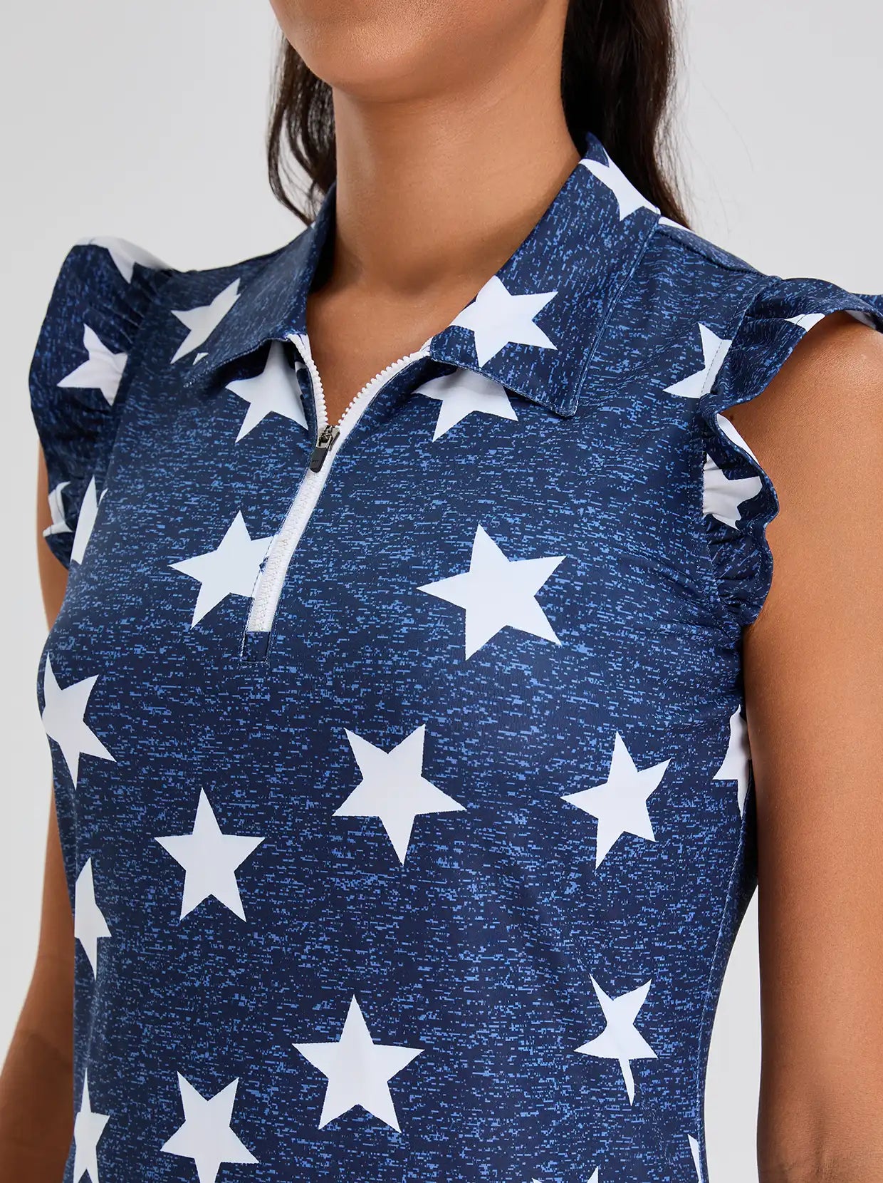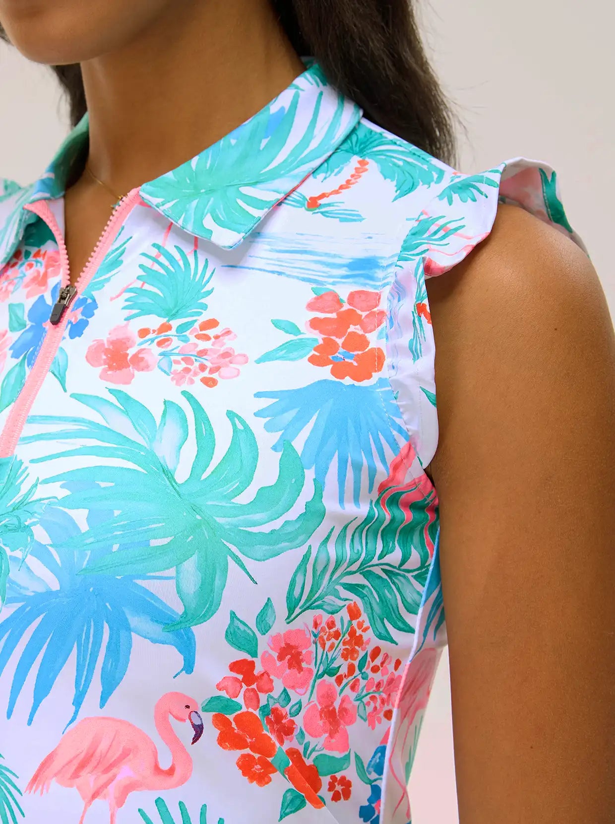 Highlights: UPF50+ (UVA/UVB), streamlined fit, ruffled sleeves