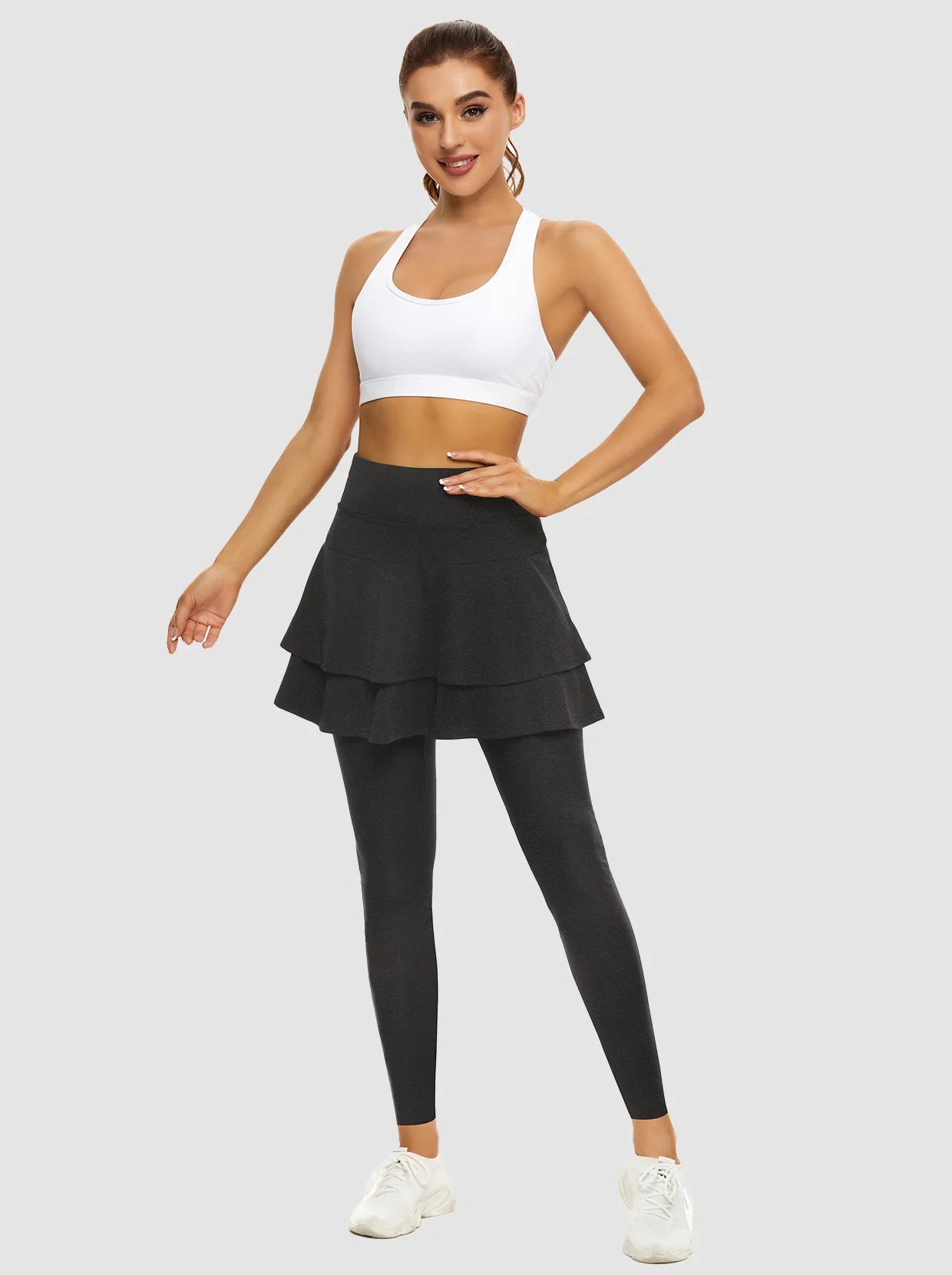 Enjoy your tennis time with our black athletic skirted leggings. Crafted from soft, breathable, and stretchy fabric, these leggings offer superior comfort and moisture-wicking performance. The double layer provides both coverage and flair, while the side pockets keep your essentials within reach. The wide, flat waistband ensures a secure and comfortable fit.