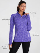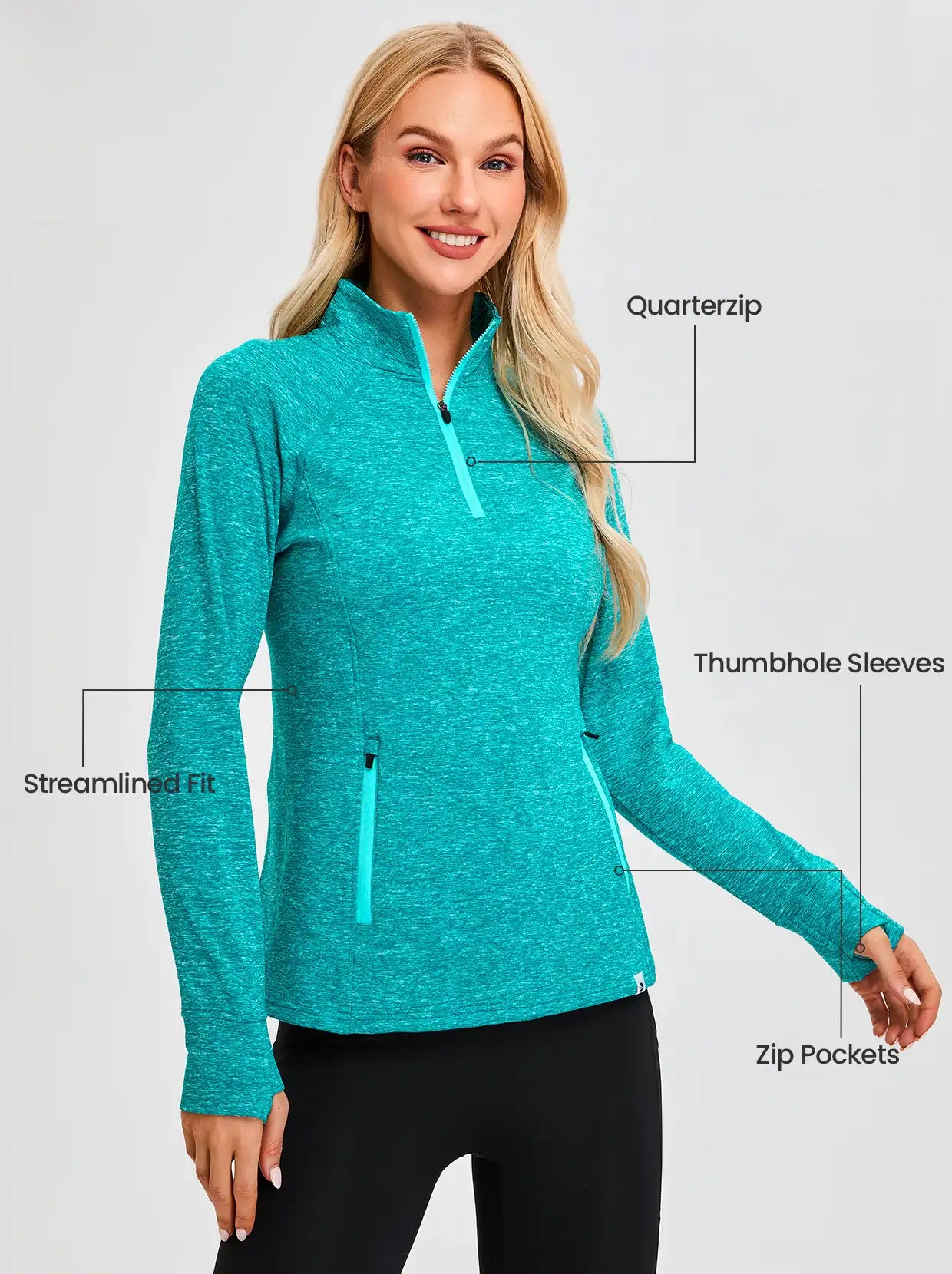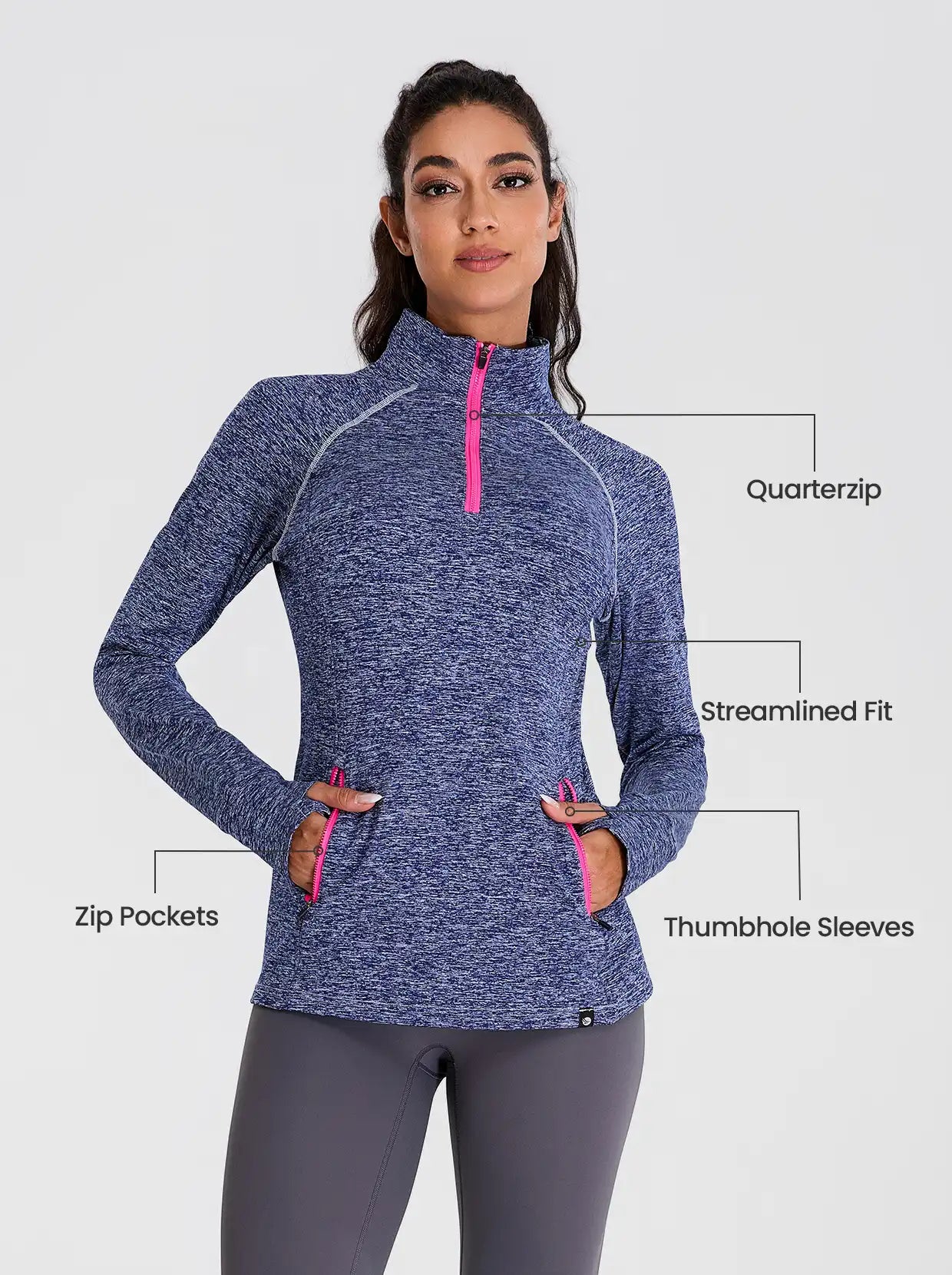 Keep warm and active during your runs with our women's quarter-zip fleece top. Designed for active lifestyles, this top features a soft, fleece lining, quick-dry fabric, and 4-way stretch for maximum comfort and mobility. With side zippered pockets to keep your essentials secure, thumb holes for added warmth and protection, you'll be ready to tackle any weather.