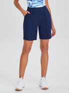 Move boldly in our golf navy shorts with 4-way stretch fabric for ultimate freedom. Secure your essentials in two back and two side zipper pockets. The center-pressed crease sharpens your look, while the elastic waistband ensures a perfect fit.