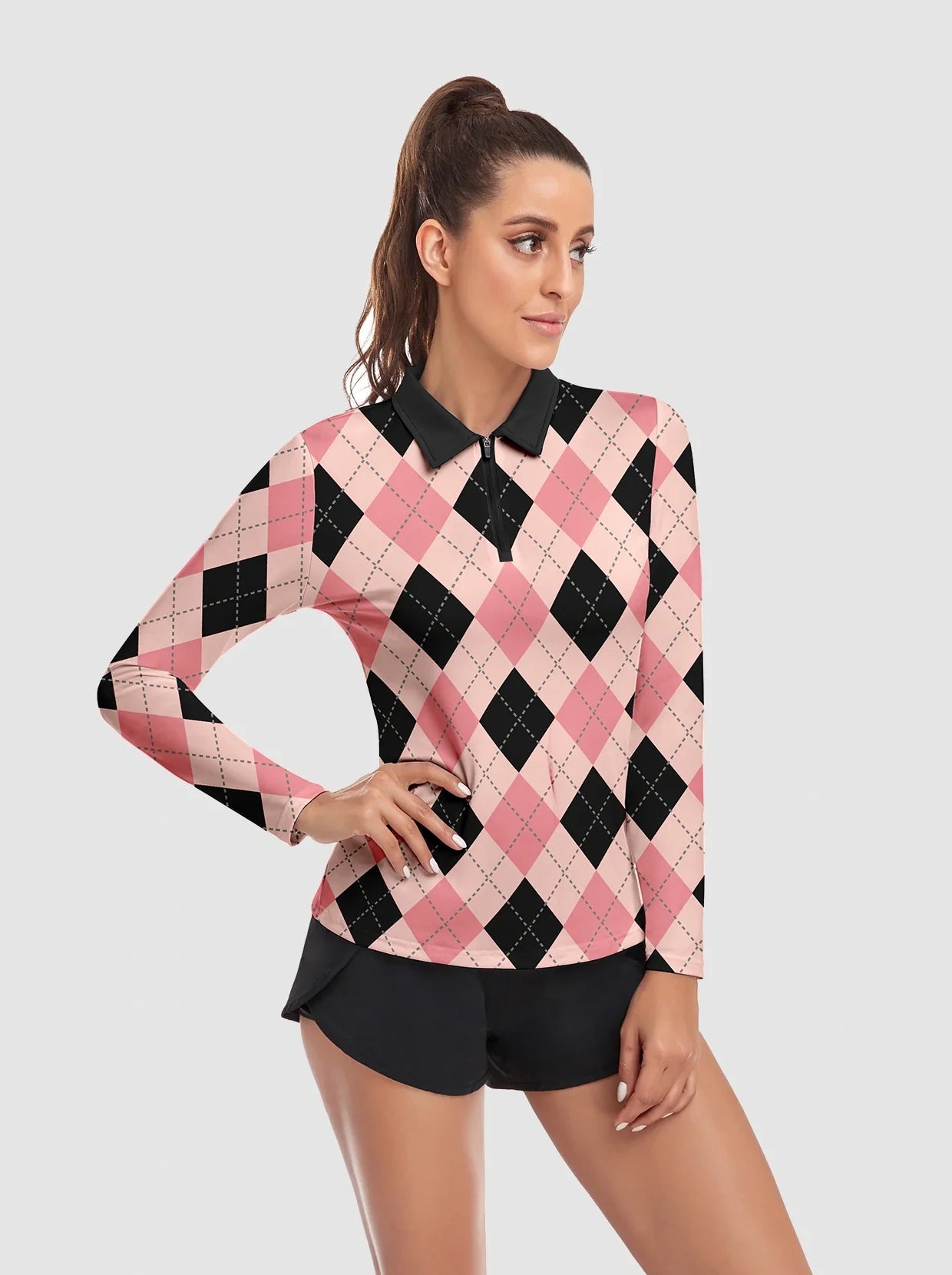 Pink and Black Checkerboard Quarter-zip Long-sleeve Polo Shirt