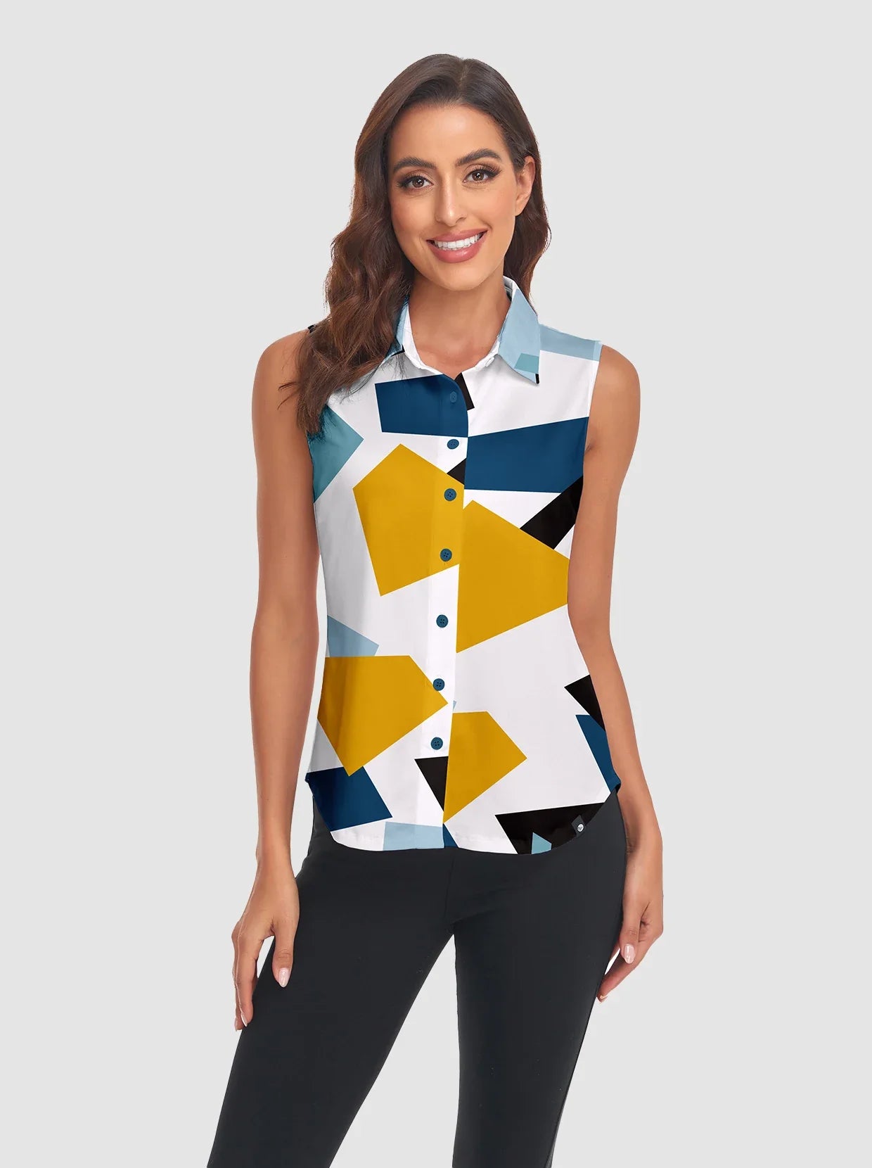 Geometric Print Button-Down Sleeveless Polo Shirts For Women