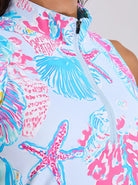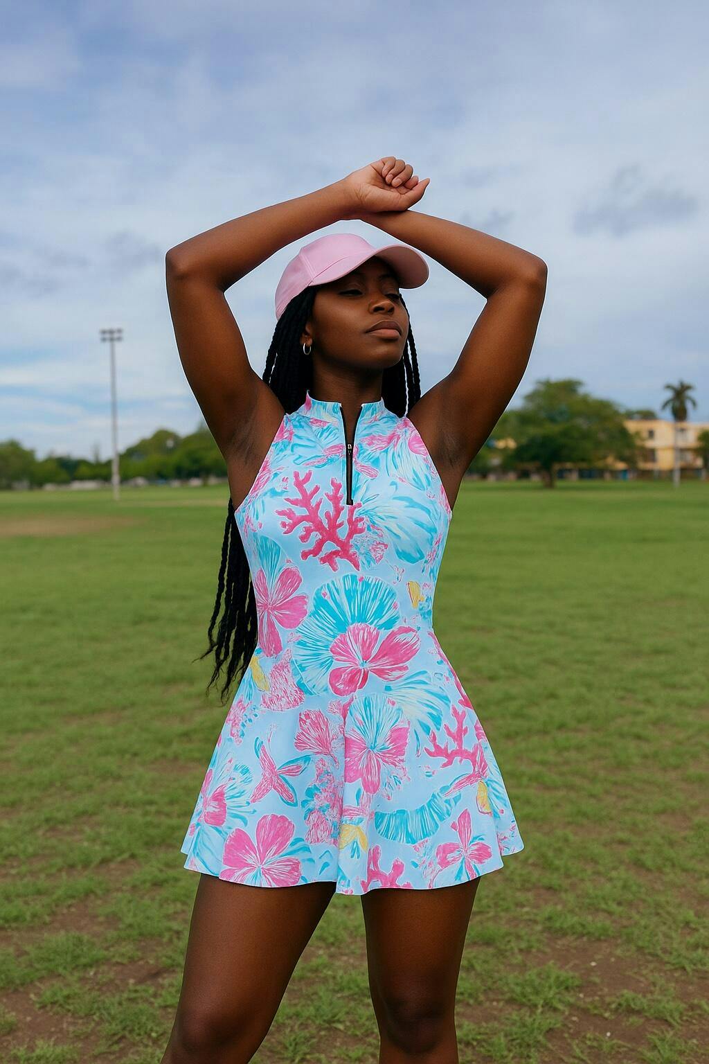 From our Ocean Breeze Collection, this 34" sleeveless dress, with its vibrant "Coral Mirage" print and chic stand collar, offers effortless coastal charm. Integrated shorts ensure freedom of movement. Crafted for comfort, it lets you confidently embody summer's playful spirit and express your unique style on and off the green.