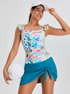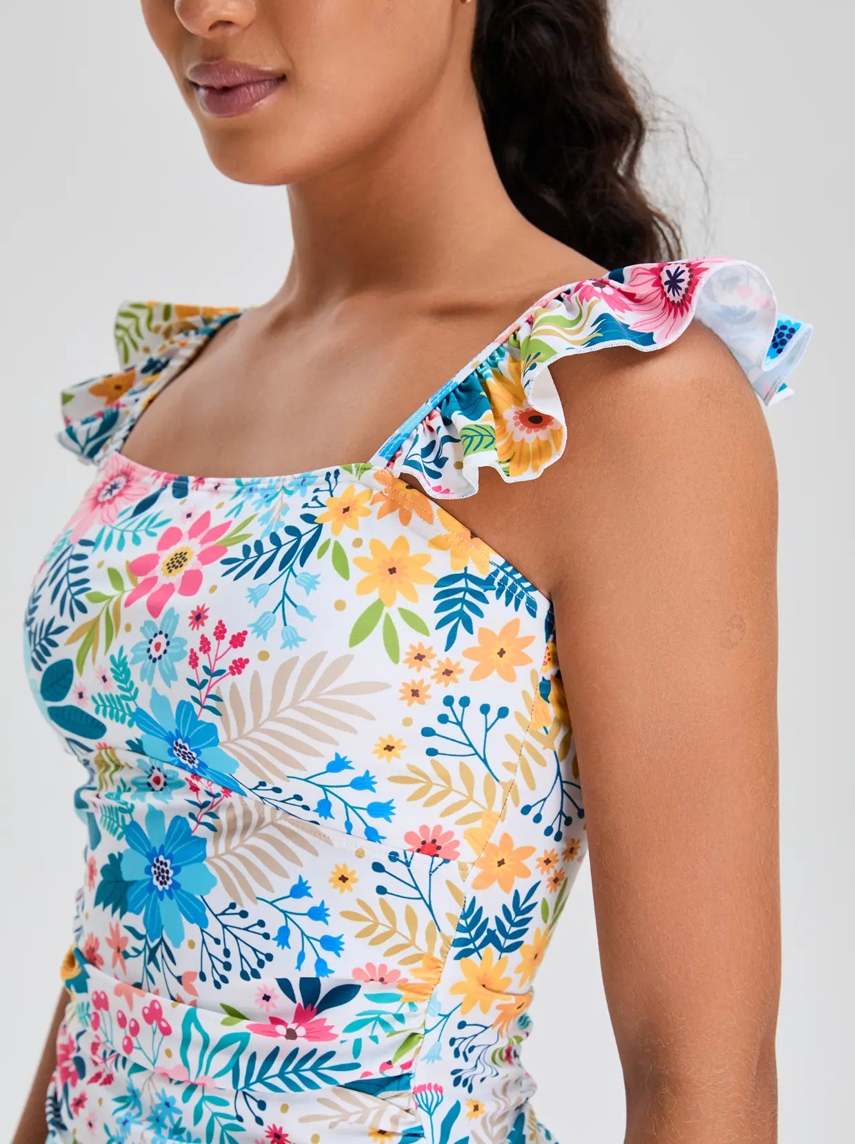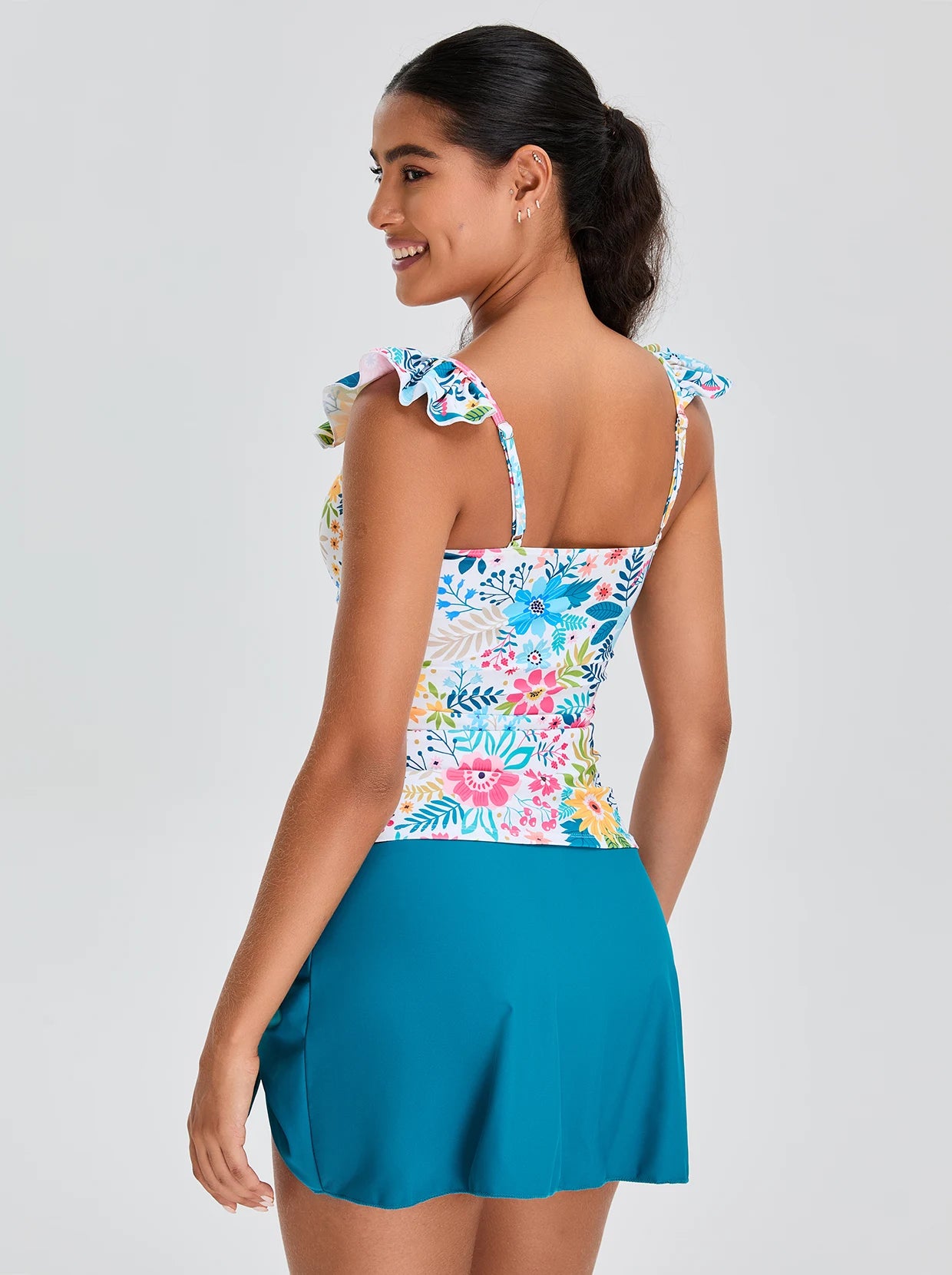 Daisy Print Ruffled Tankini Top with Built-in Bra