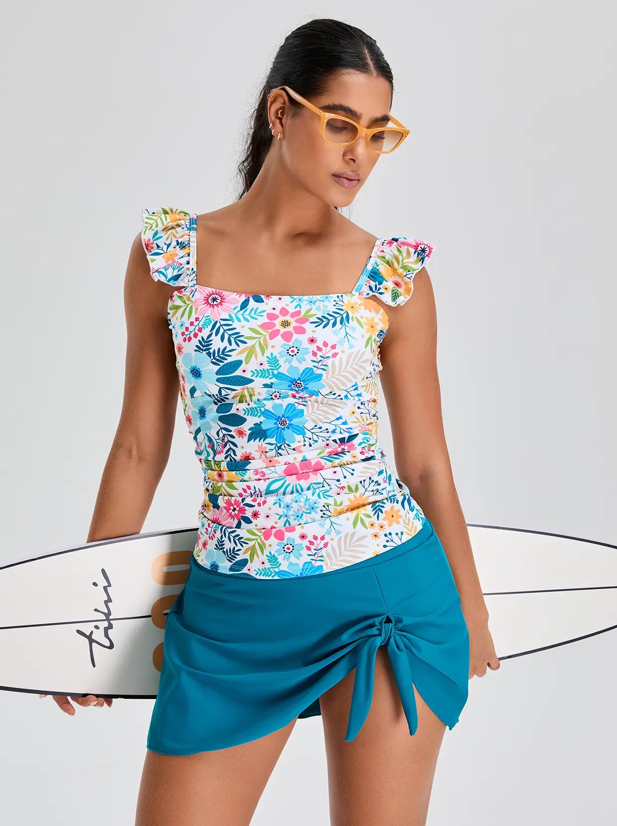 Experience the perfect blend of fashion and function with our daisy tankini top. Crafted from breathable, quick-dry material, it offers UPF50+ sun defense to keep you safe from the sun's rays. Design details include a sophisticated square neckline, figure-enhancing side ruching for an adaptable fit, and adjustable straps for tailored support. Plus, removable cups let you customize your padding.