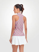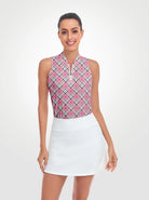 Step into effortless style and comfort with the Pink and White Checkerboard Quarter-Zip Sleeveless Shirt. Its stretch fabric is both breathable and moisture-wicking, adapting to your every move whether you're on the golf course, tennis court, in the office, or out and about. The sleek collarless quarter-zip not only provides a contemporary look but also keeps you feeling cool and supported from morning to night.