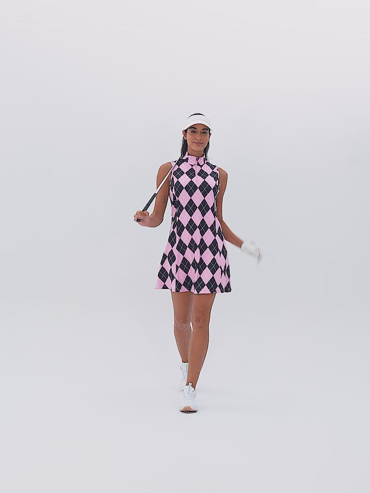 This versatile dress is perfect for a variety of activities, from golf and tennis to everyday outings. It's designed with a moisture-wicking fabric that keeps you cool and dry, while the soft and breathable material allows for comfortable movement. Plus, the convenient pockets make it easy to store your phone or other small essentials. With a stylish pink and blue checkerboard print and a flattering quarter-zip collar, this dress is a must-have for any active wardrobe.