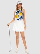 Blue and Yellow Floral Racerback Sleeveless Button-down Polo Shirt