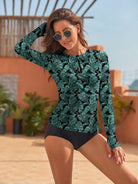 Green Leaves Zipper Long-sleeve Rash Guards for Women