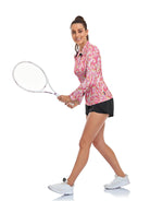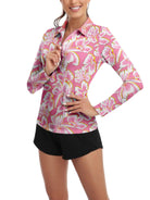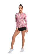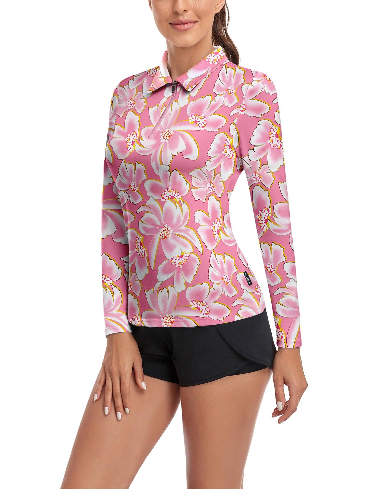 Get noticed on the course with a playful twist on traditional golf attire. This long-sleeve shirt features a pink floral print and is made with UPF50+ (UVA/UVB) fabric for added sun protection. The moisture-wicking and breathable material will keep you cool and comfortable as you conquer the golf course. Plus, the streamlined fit and quarter-zip collar add a touch of style and functionality to your game. Perfect for golf, tennis, pickleball, and team matches, this shirt is sure to make a statement wherever you go.