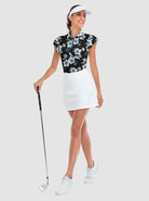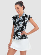 Elevate your golf game with our stunning Floral Quarter-Zip Polo. This chic and sophisticated design features a classic polo collar and a trendy quarter-zip closure, perfect for layering. The delicate white floral pattern against a sleek black background creates a timeless look that's both elegant and sporty. The ruffle sleeves add a feminine touch, while the streamlined fit ensures you look and feel your best. Crafted from a breathable, moisture-wicking fabric, this polo is perfect for staying cool and comfortable on the course.