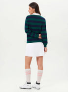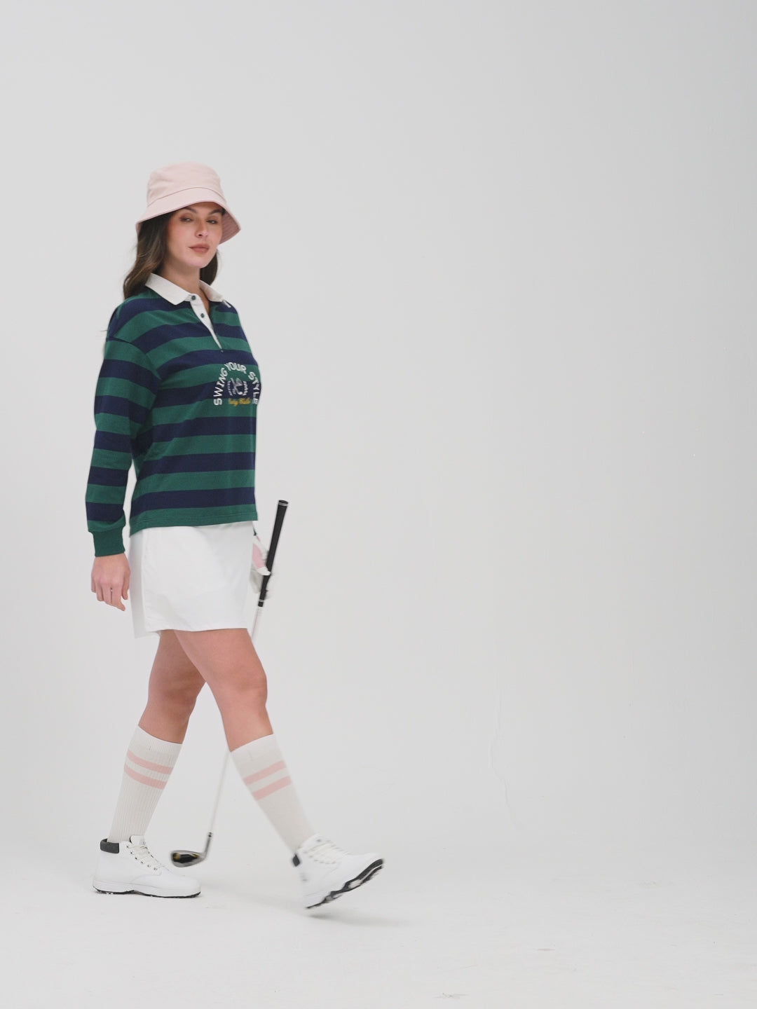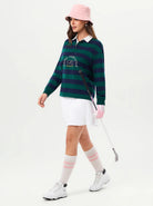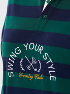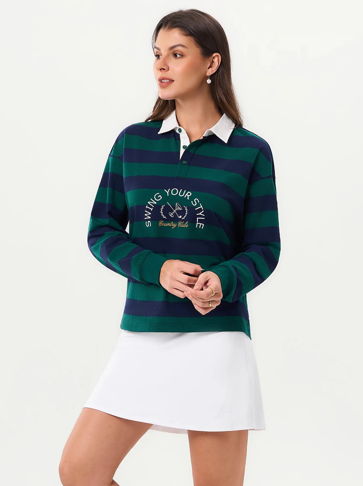 From our Fall for Classics Collection. Layer up with style! This sporty sweatshirt features a classic button collar with a vibrant color pop and a fresh look thanks to bright green stripes and white print. Ribbed cuffs keep the fit snug. Soft, breathable, and perfect for the course, the court, and beyond!