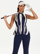 Stay cool and look chic in our Striped Sleeveless Peplum Top. Featuring a stylish stand collar and a button-down design, this shirt offers a polished look for any activity. The breathable, 4-way stretch fabric ensures maximum comfort and freedom of movement for sports like golf, tennis, or pickleball. The flattering peplum hem adds a touch of elegance for seamless day-to-night wear.