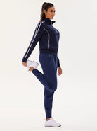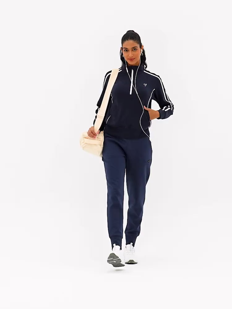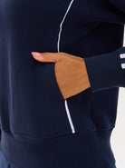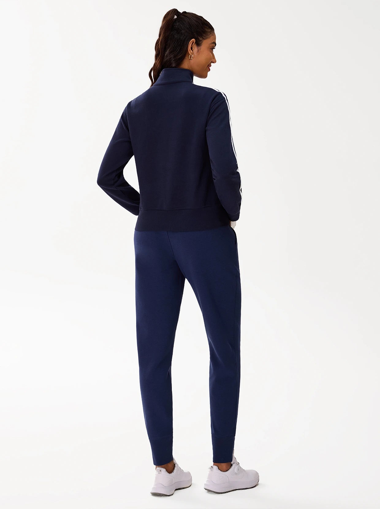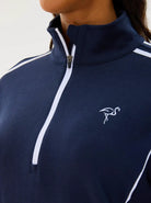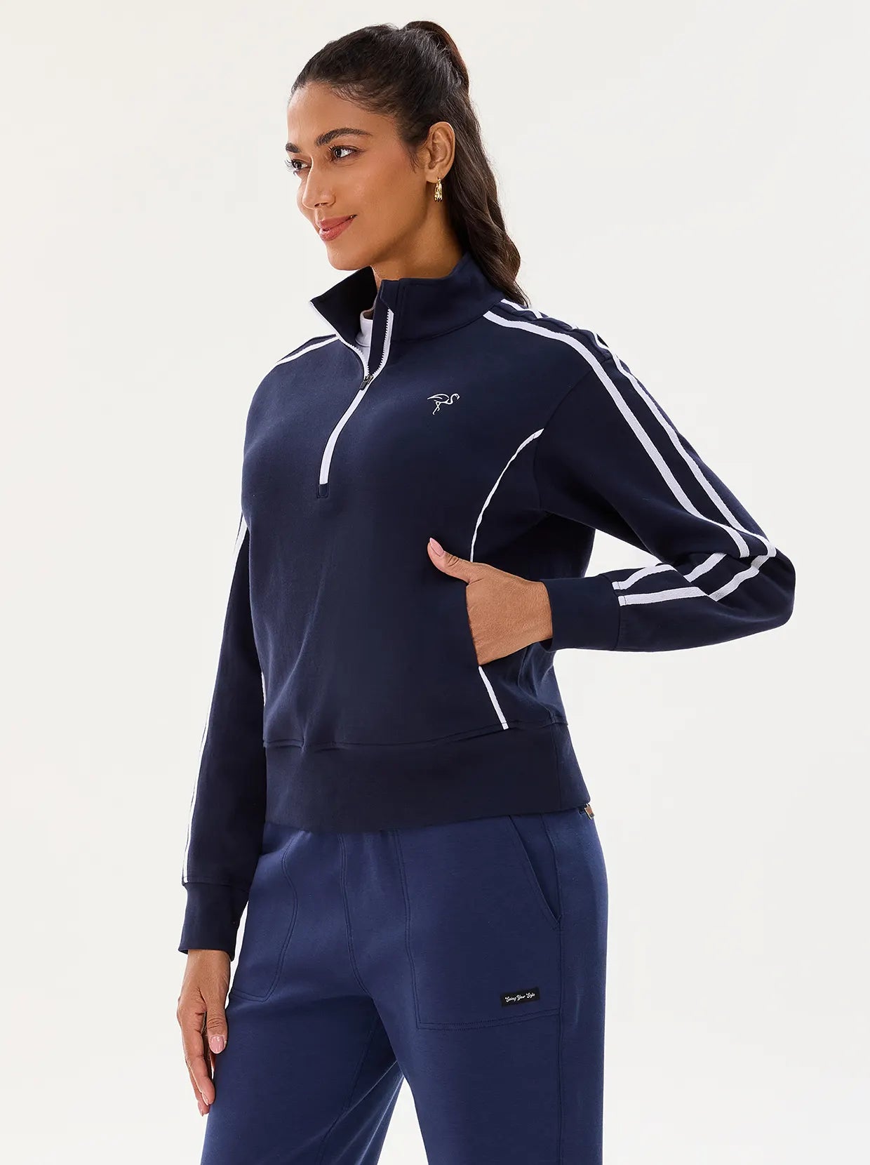 Elevate your athletic wardrobe with this playful navy quarter-zip sweatshirt. The skin-friendly fabric feels buttery soft against your skin, while the 3-layer construction delivers reliable warmth and lasting durability. Reinforced ribbed cuffs and hem keep their shape and seal in warmth through every activity. The timeless navy and white color block pairs seamlessly with your existing pieces.