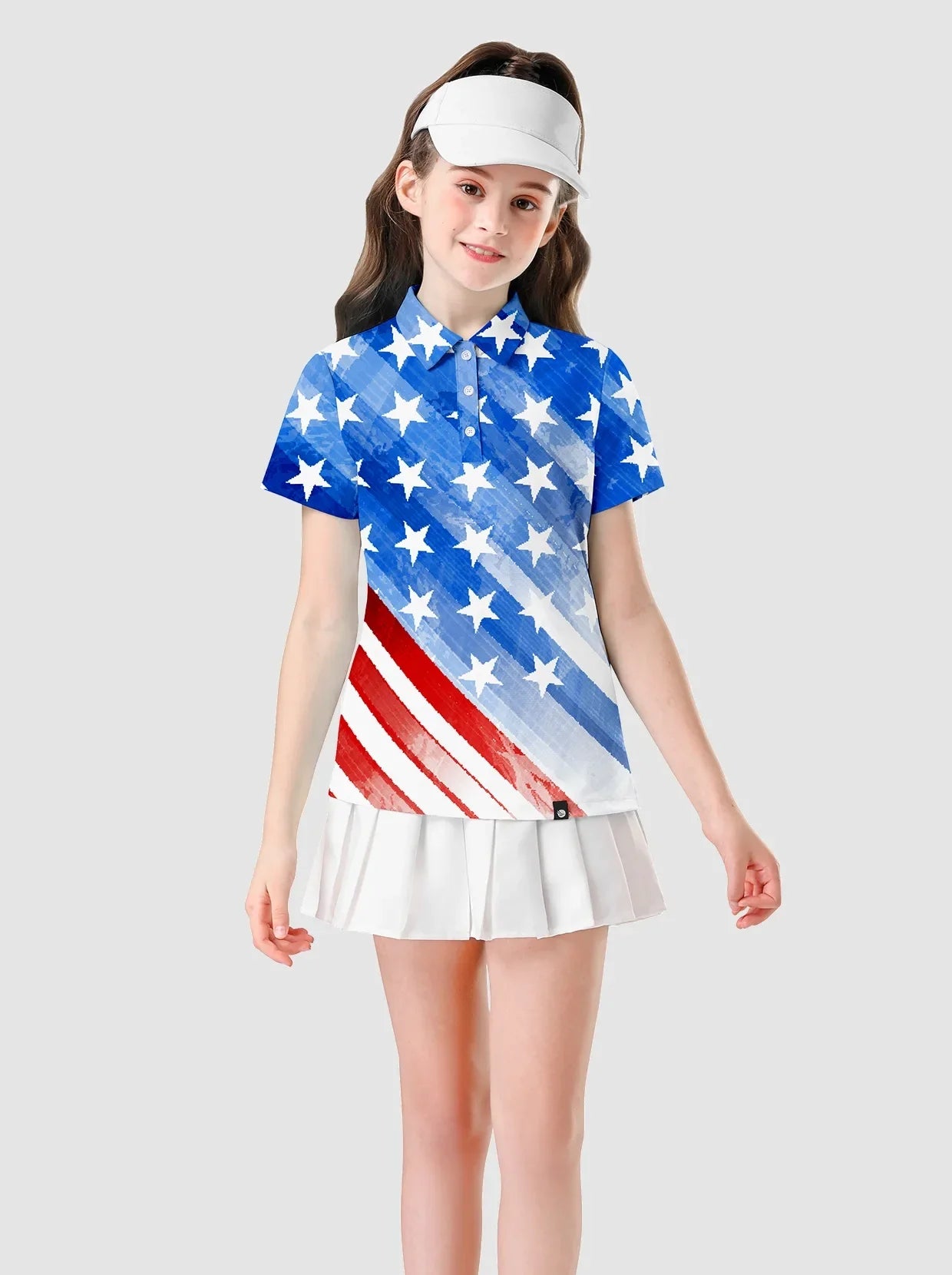 White Star Button-Placket Short-sleeve Polo Shirt for Girls