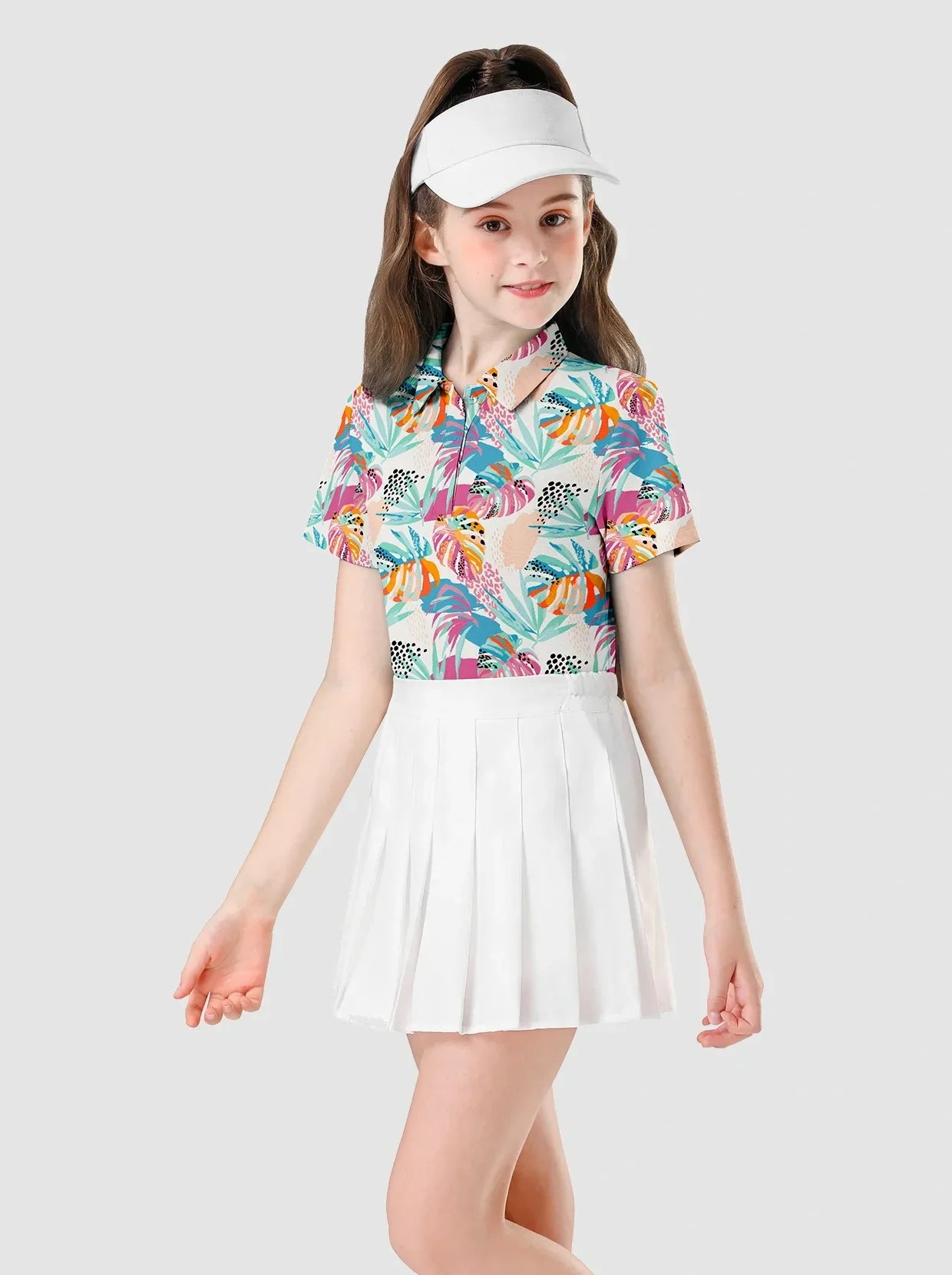 Colorful Leaf Button-Placket Short-sleeve Polo Shirt for Girls